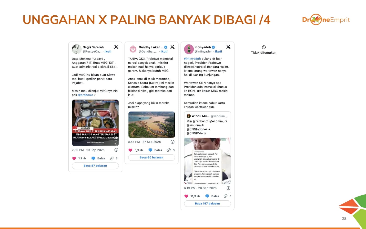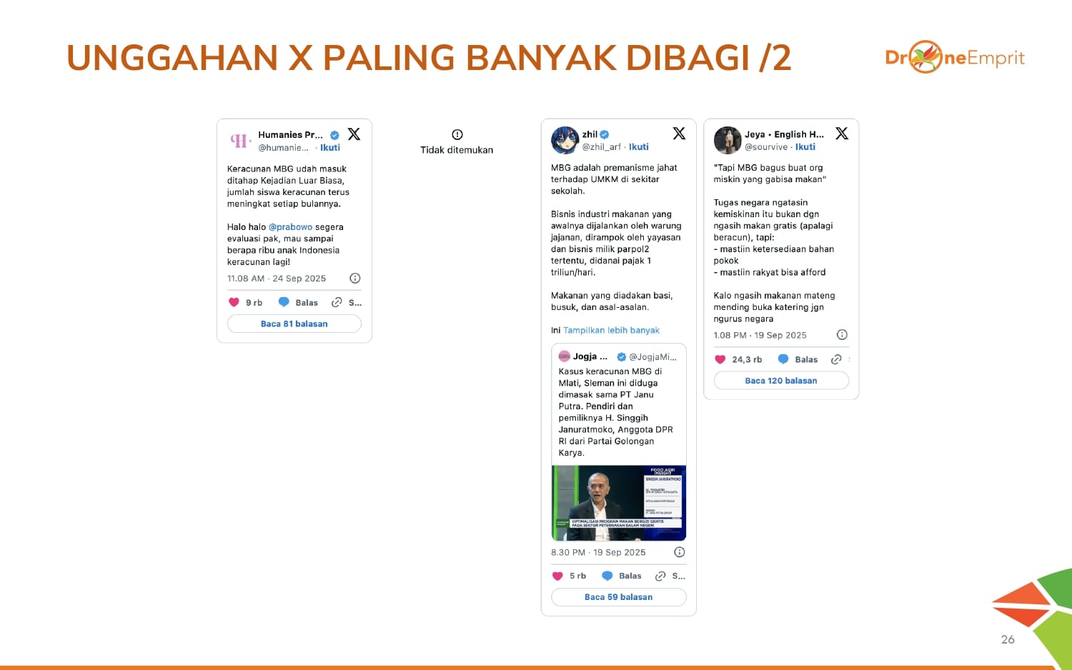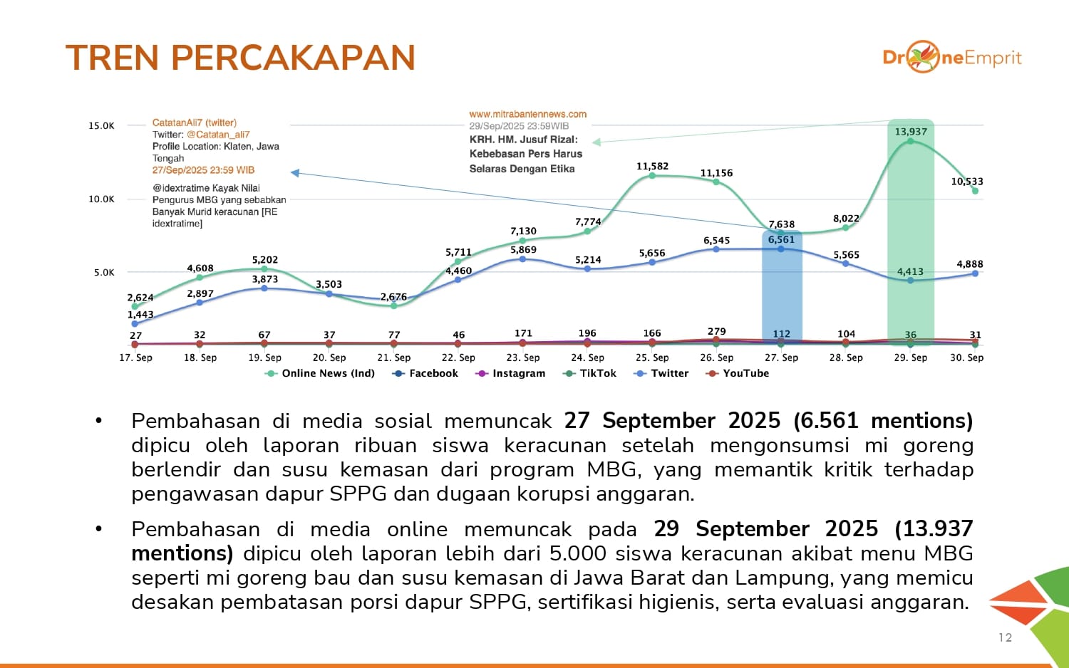Puncak percakapan terjadi pada 27 & 29 September, dipicu oleh laporan ribuan siswa keracunan mi goreng berlendir & susu kemasan. Insiden ini memantik kritik massal terhadap pengawasan & dugaan korupsi.