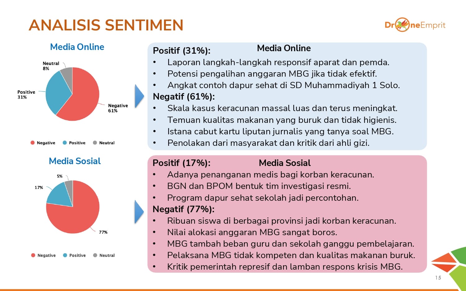 Di media online, sentimen negatif mencapai 61%, sementara di media sosial meroket hingga 77%. Isu keracunan, kualitas buruk, & anggaran boros menjadi pendorong utama sentimen negatif di kedua platform.