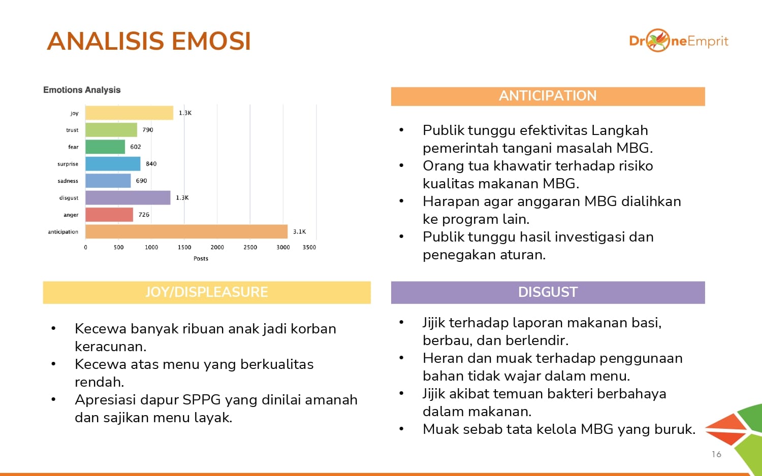 Emosi yang paling menonjol adalah Disgust (jijik & muak) terhadap laporan makanan basi & tata kelola yang buruk. Diikuti Anticipation (cemas & harap) akan langkah pemerintah & hasil investigasi.