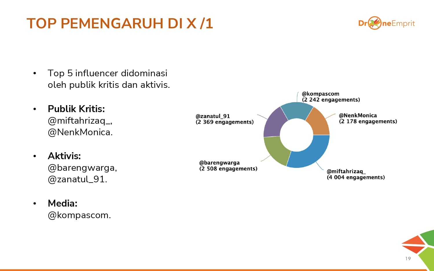 Di platform X, suara dominan datang dari kelompok publik kritis & aktivis, menunjukkan bahwa narasi kontra-pemerintah memiliki jangkauan lebih luas & efektif dalam membentuk opini publik.