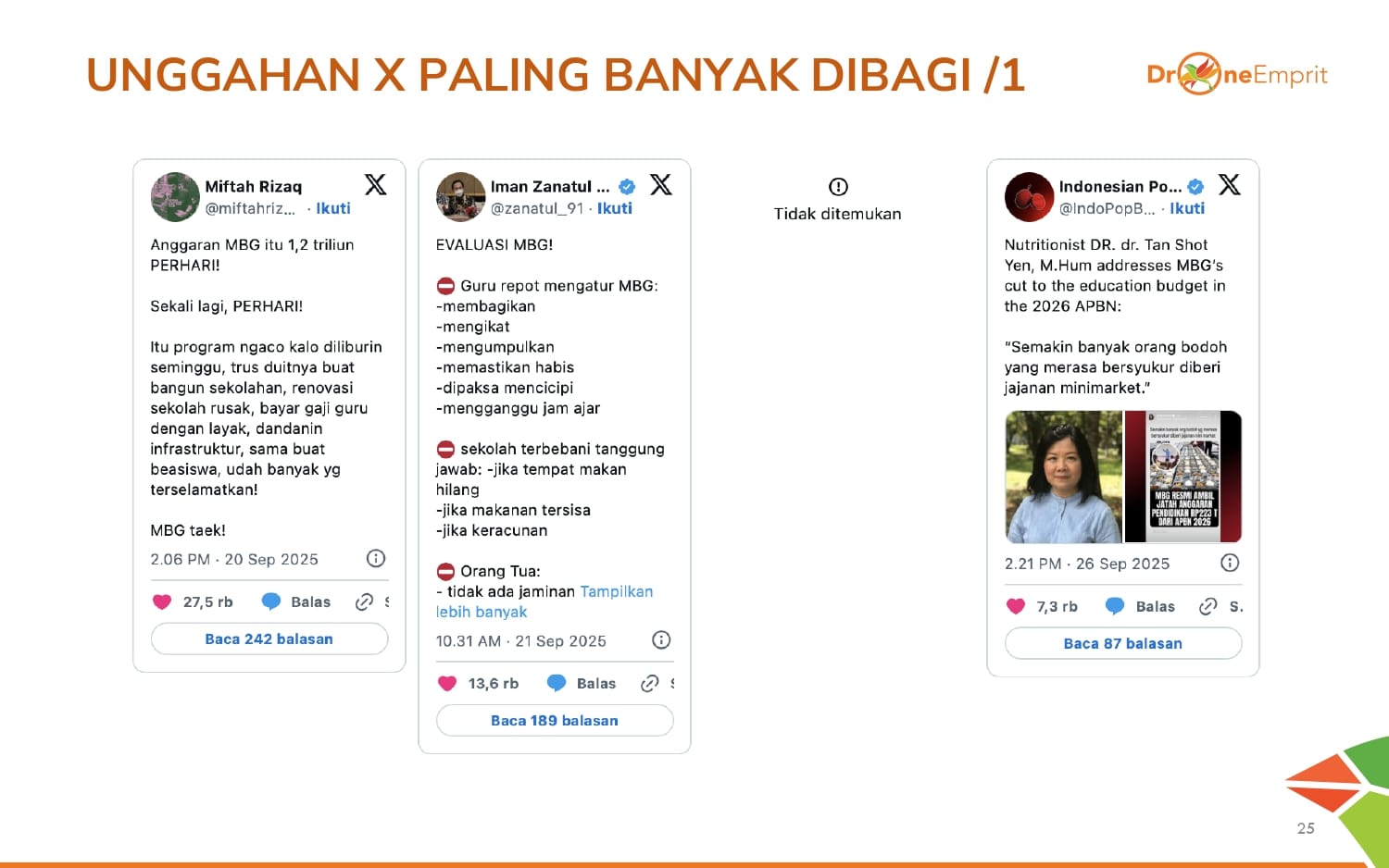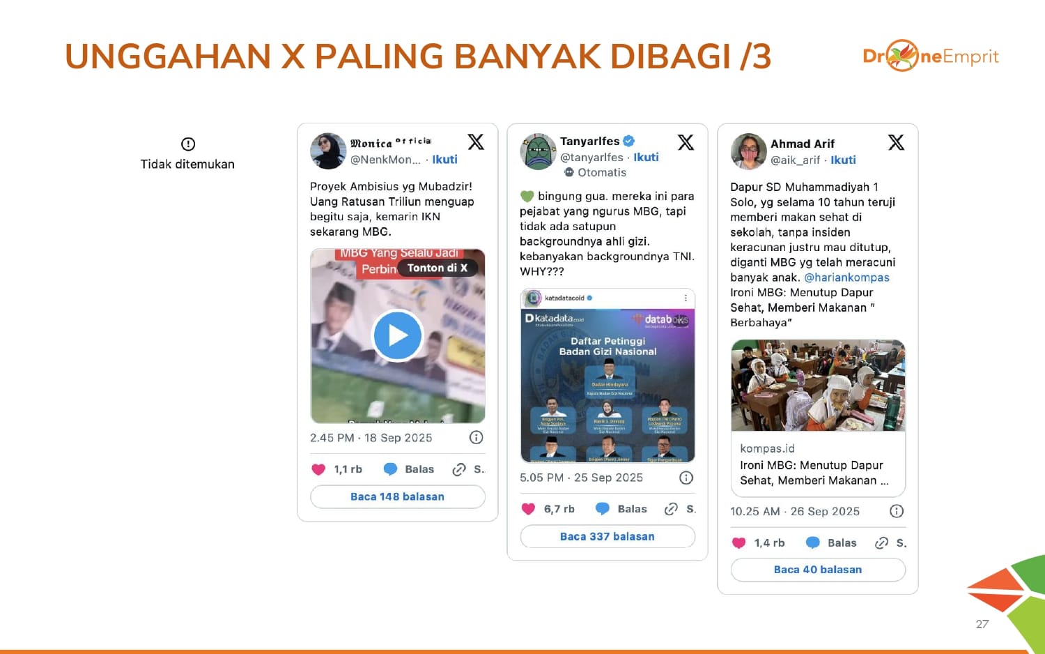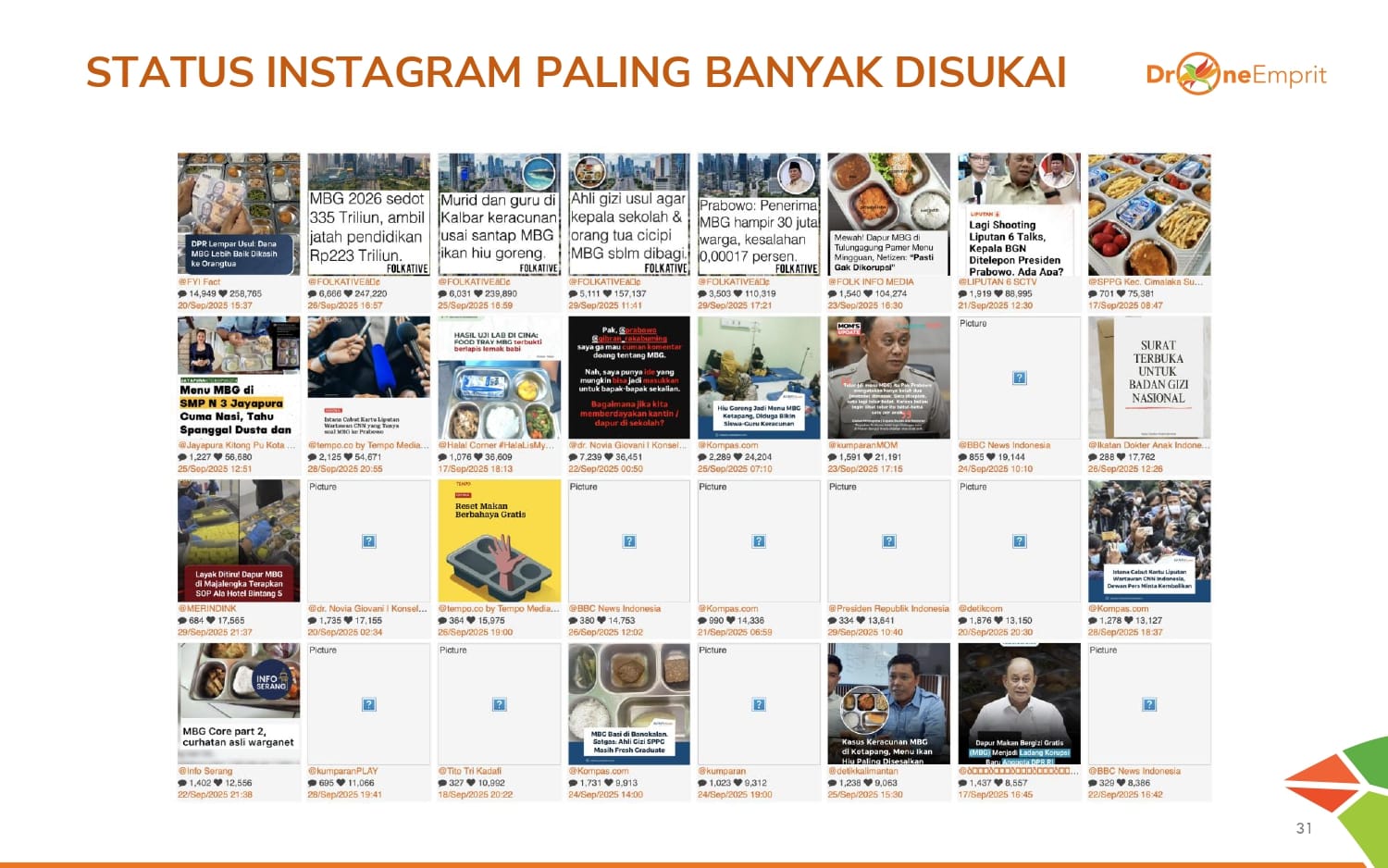 Di Instagram, konten terpopuler menyoroti pemotongan anggaran pendidikan untuk MBG, laporan kasus keracunan di berbagai daerah, serta usulan pelibatan kantin sekolah sebagai solusi pengawasan.