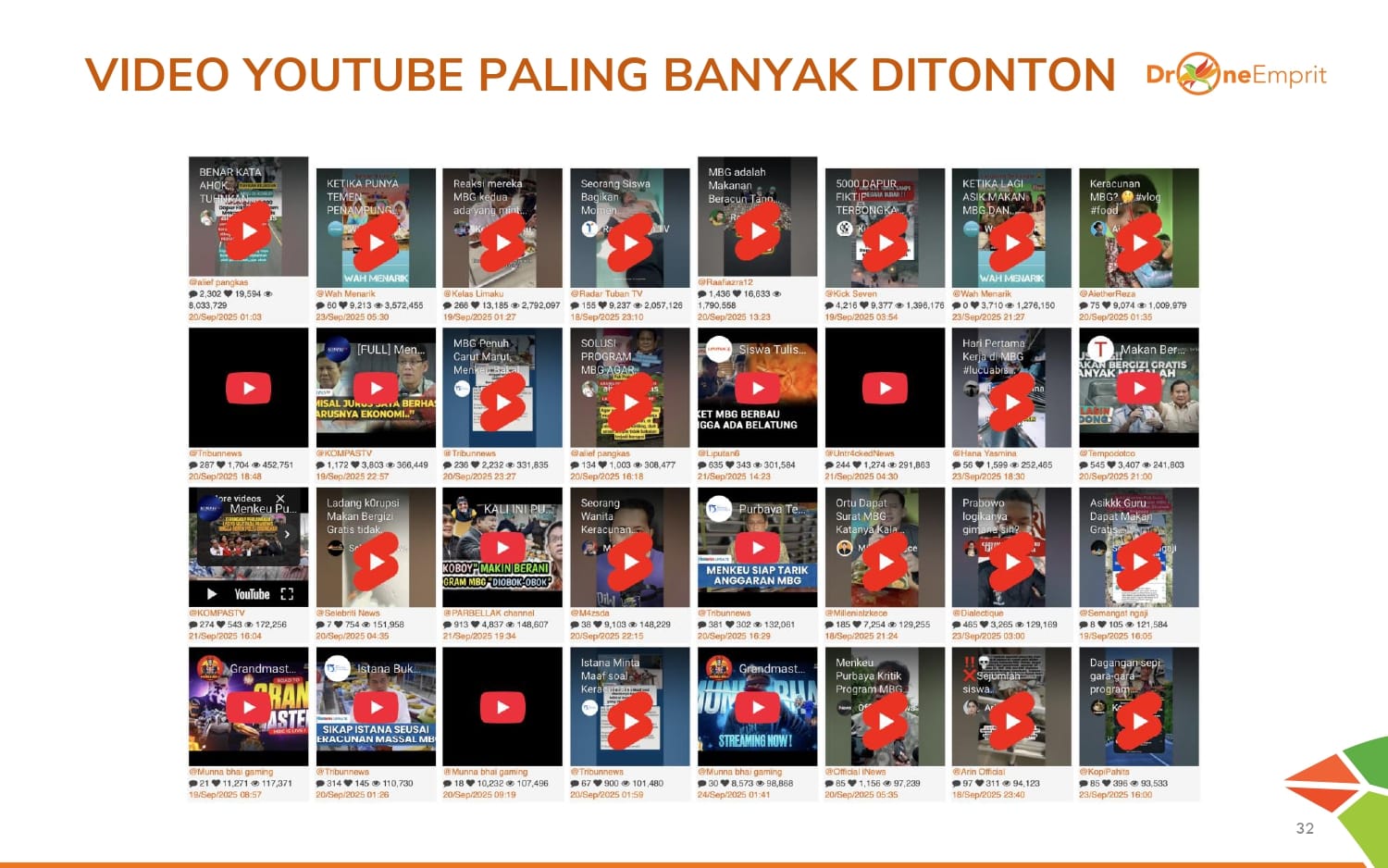 Video YouTube terpopuler didominasi oleh konten yang mengasosiasikan MBG dengan korupsi, sketsa komedi tentang program, serta laporan investigasi mengenai dugaan dapur fiktif & masalah di lapangan.