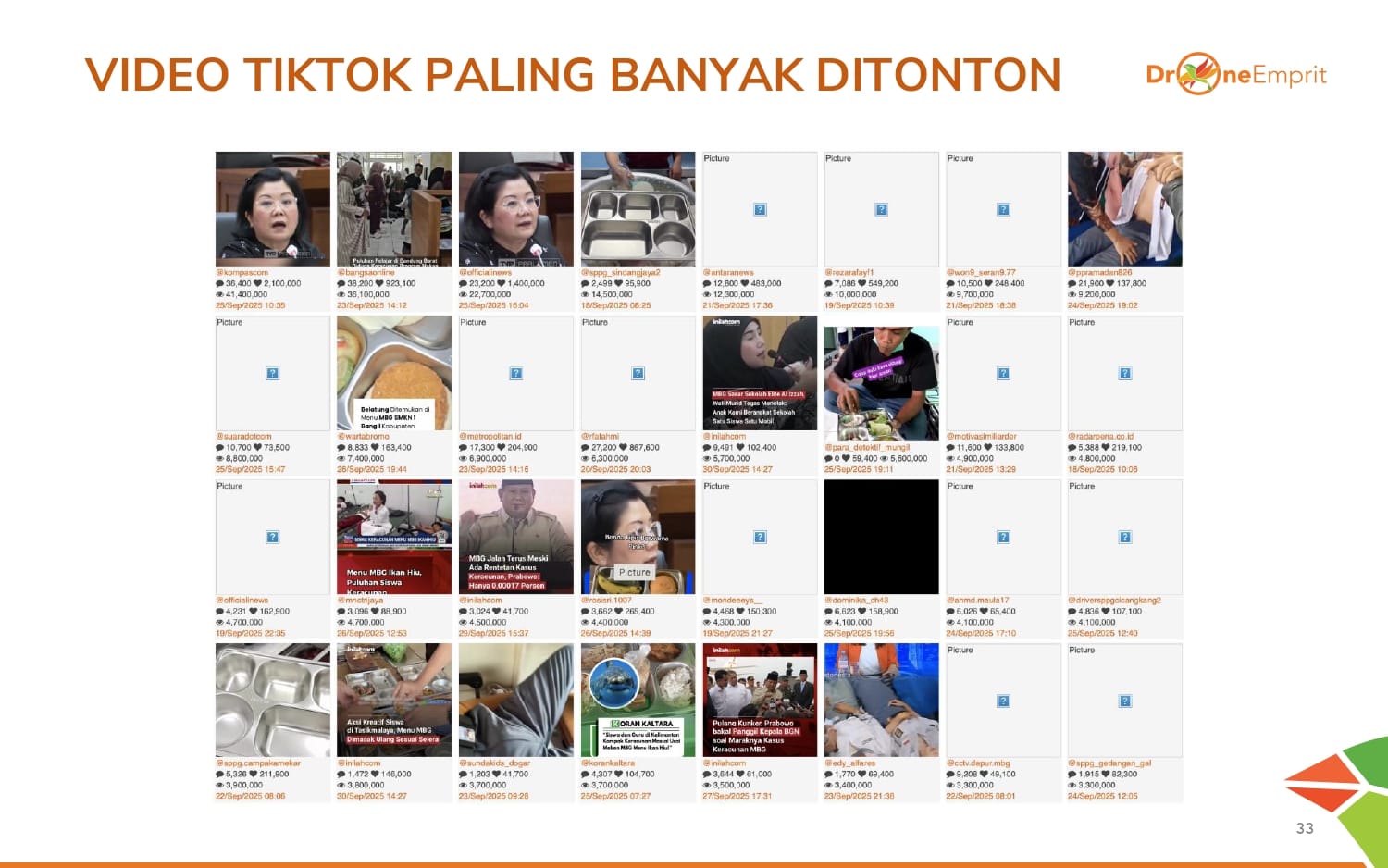 Di TikTok, kritik tajam dari ahli gizi Tan Shot Yen, laporan keracunan massal, serta konten perbandingan antara dapur MBG yang sukses & yang gagal menjadi video yang paling banyak ditonton & dibagikan.