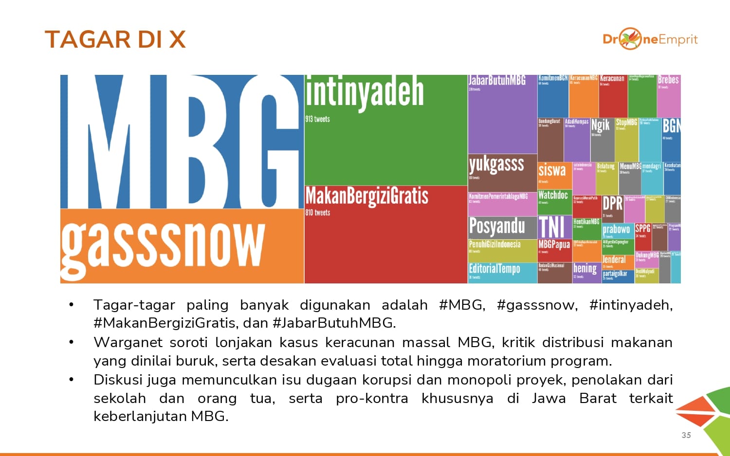Tagar #MBG & #MakanBergiziGratis menjadi yang terpopuler, namun digunakan untuk menyuarakan kritik, desakan evaluasi, hingga tuduhan korupsi. Ini menunjukkan tagar resmi program telah "dibajak" oleh narasi kritis.