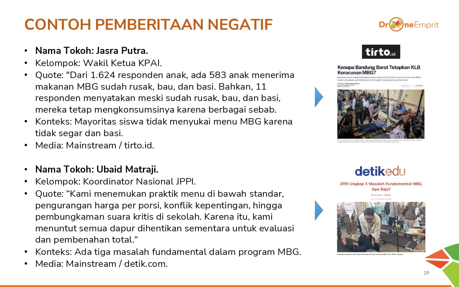 Pemberitaan negatif mendominasi, menyoroti temuan KPAI tentang makanan basi yang diterima siswa, serta desakan dari JPPI untuk menghentikan sementara program karena adanya masalah fundamental seperti konflik kepentingan & pembungkaman kritik.