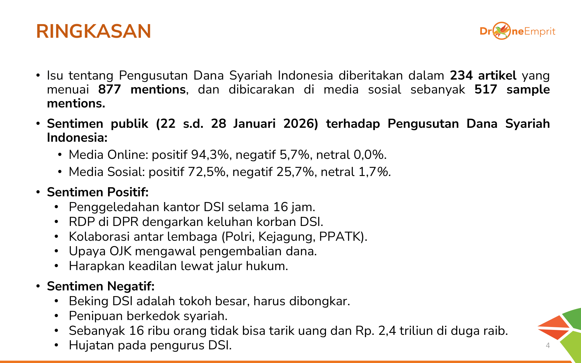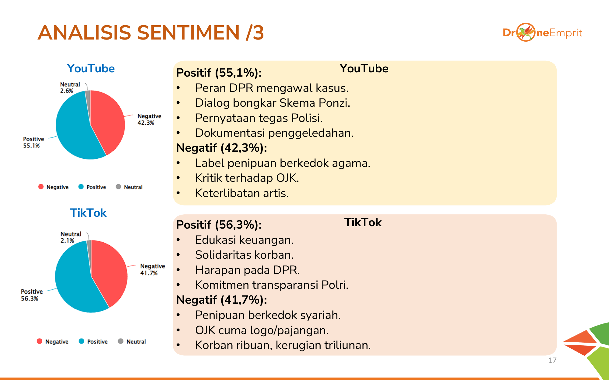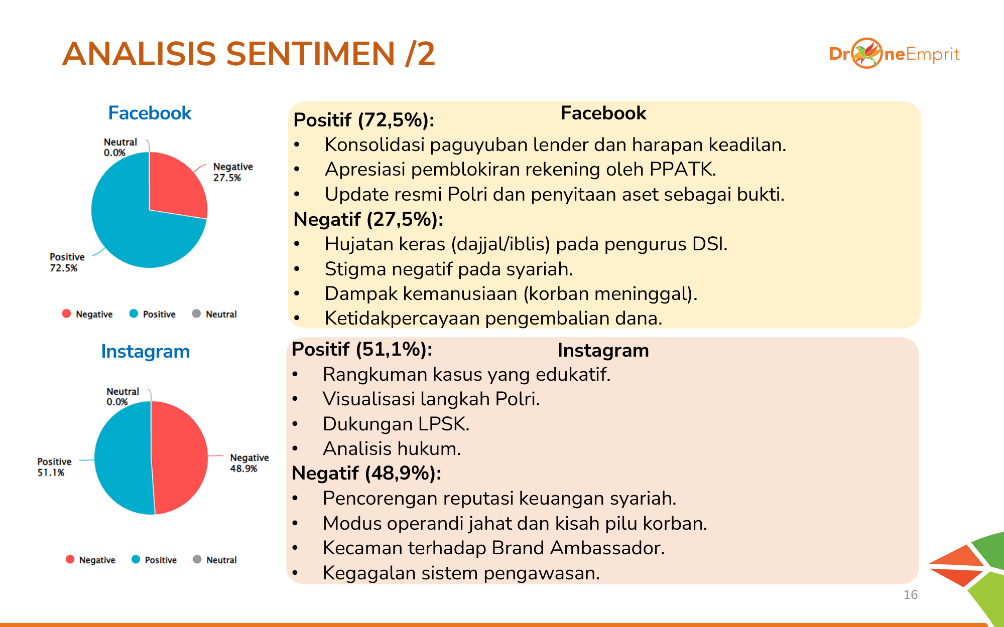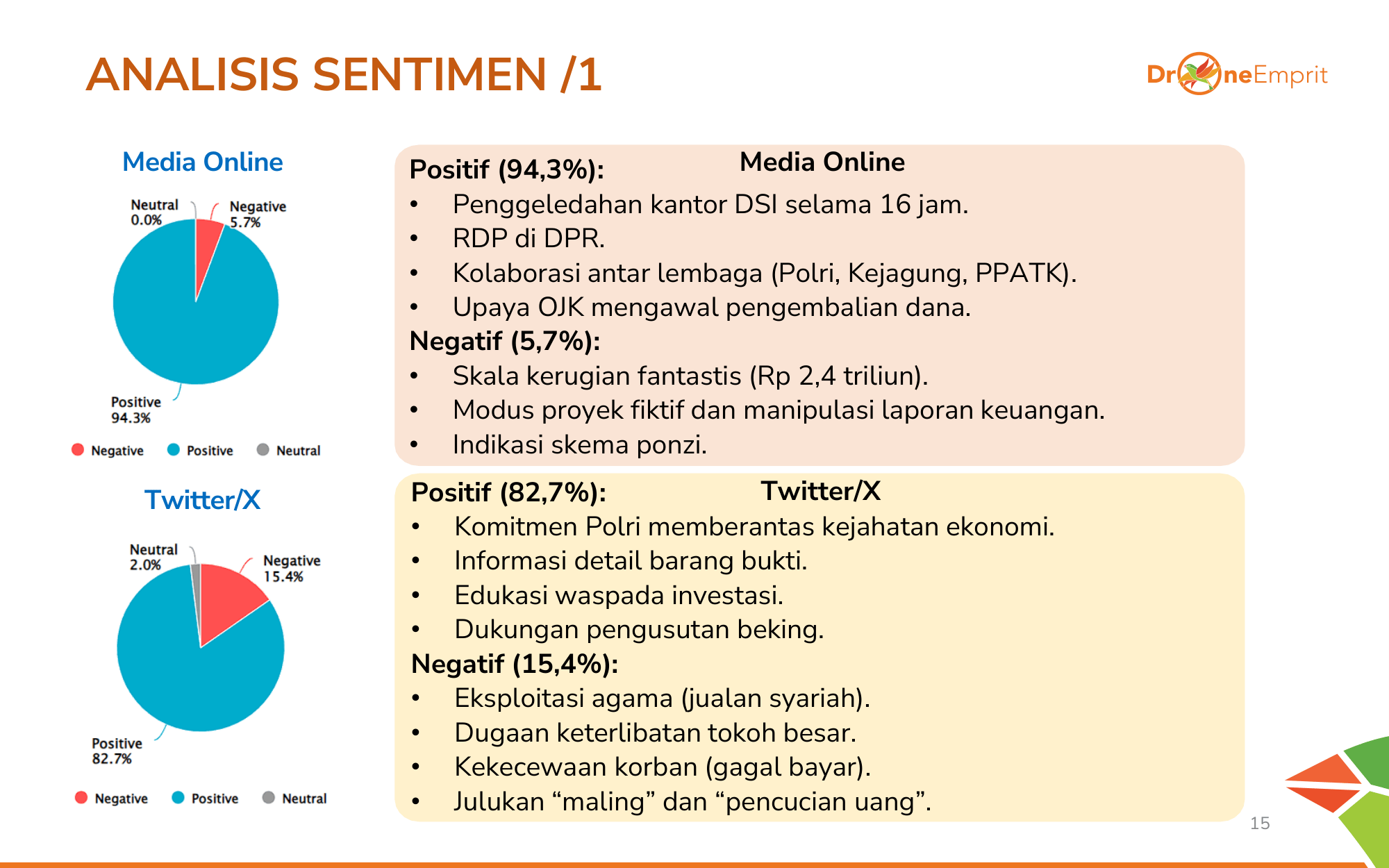 Media Online didominasi sentimen positif karena fokus pada aksi kolaborasi lembaga negara. Di X, meski positif pada Polri, ada nada negatif soal eksploitasi agama dan kekecewaan korban yang mendalam terkait gagal bayar.