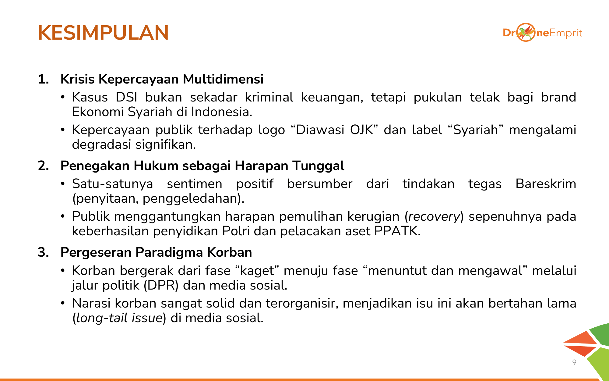 Krisis kepercayaan ini adalah pukulan telak bagi brand Ekonomi Syariah. Harapan tunggal publik kini ada pada ketegasan Polri dan pelacakan aset PPATK. Narasi korban makin solid dan diprediksi akan menjadi isu jangka panjang di medsos.