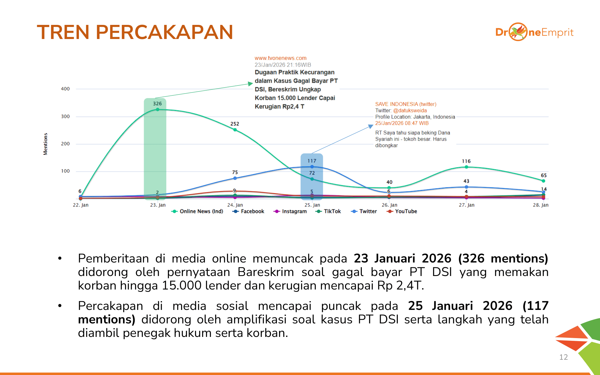 Berita memuncak pada 23 Jan 2026 saat Bareskrim rilis jumlah korban 15rb orang. Tak lama, media sosial menyusul puncaknya pada 25 Jan 2026 lewat amplifikasi langkah hukum dan dukungan masif untuk para korban.