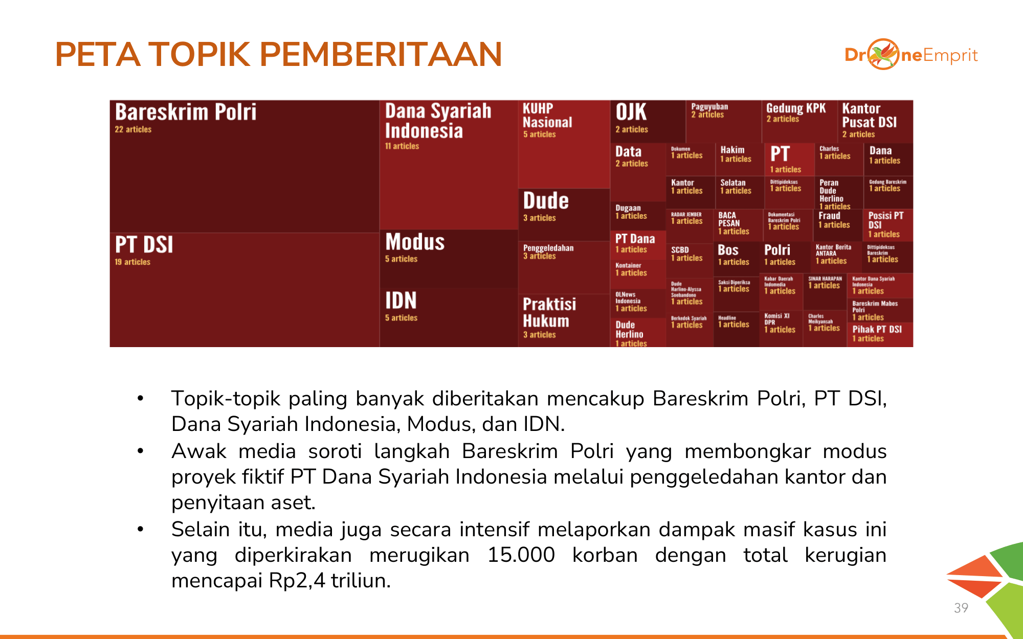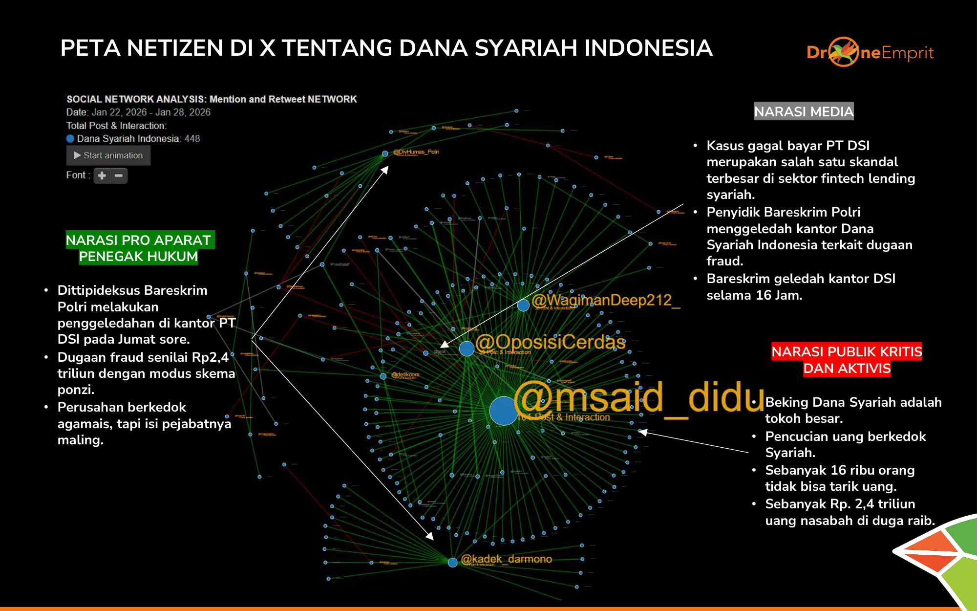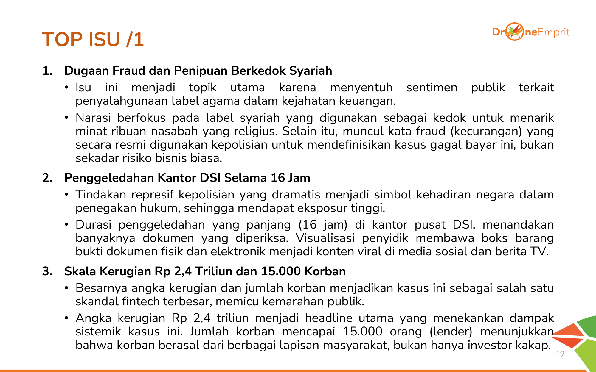 Tiga isu teratas: Dugaan fraud berkedok syariah yang melukai religiusitas publik, penggeledahan dramatis kantor DSI selama 16 jam, serta skala kerugian Rp2,4 T yang menjerat 15.000 korban dari berbagai lapisan masyarakat.