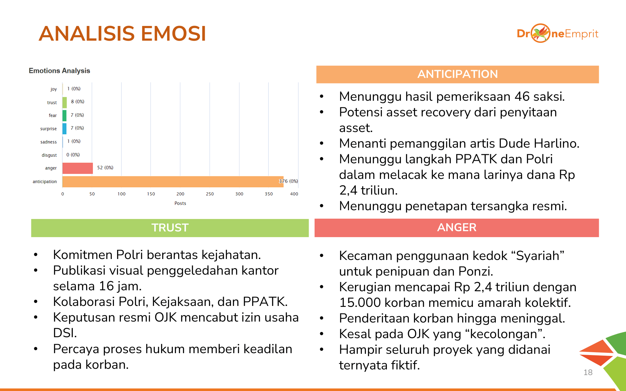 Antisipasi mendominasi: publik menunggu siapa tersangka utama. Ada pula kemarahan (Anger) akibat pengkhianatan label syariah, namun tetap ada kepercayaan (Trust) bahwa proses hukum yang transparan bisa memberikan keadilan.