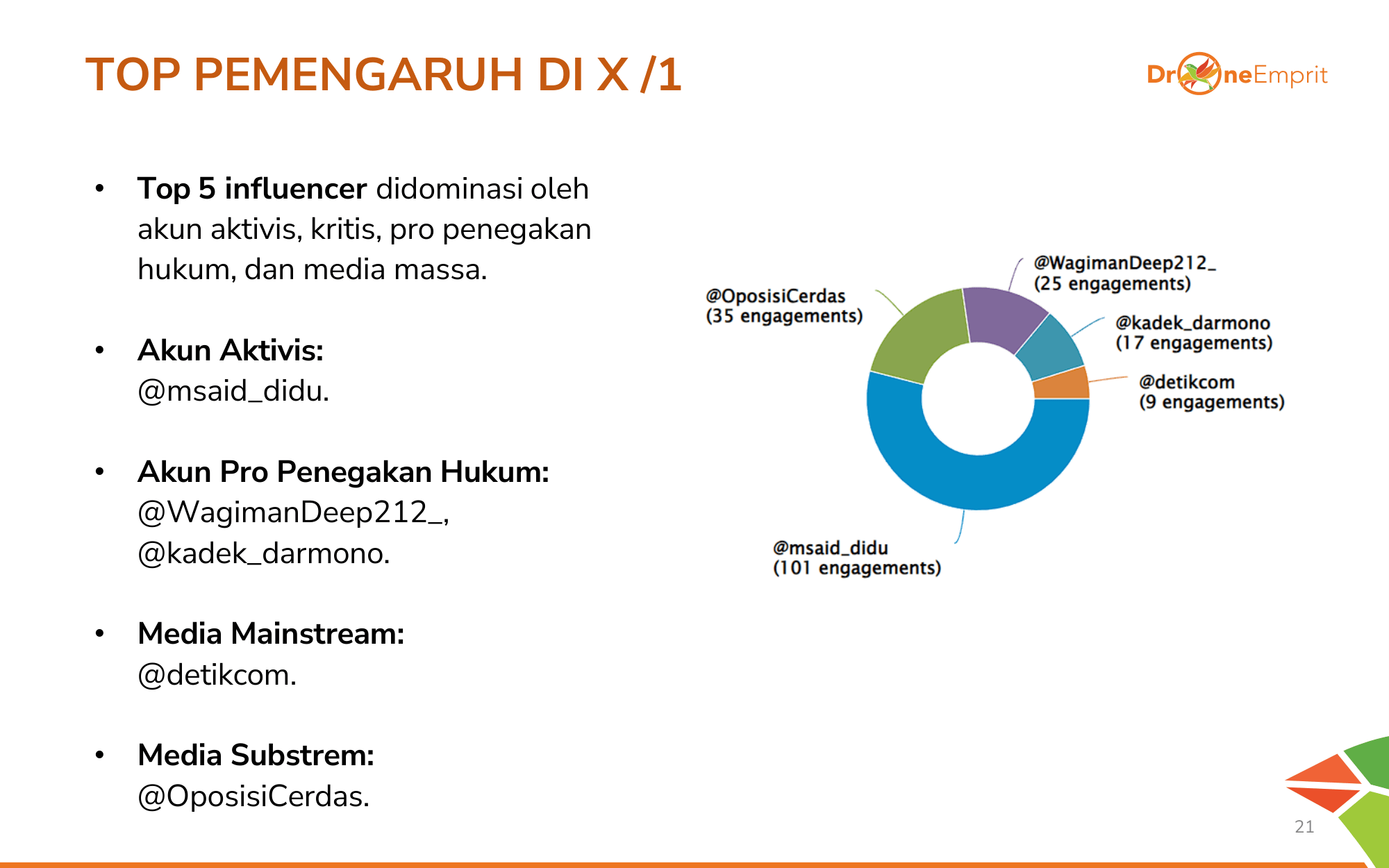 Aktivis kritis dan akun pro-penegakan hukum mendominasi. Nama-nama seperti @msaid_didu dan @WagimanDeep212_ vokal menyuarakan pengusutan tuntas, bersanding dengan akun resmi Polri dan media mainstream dalam mengawal kasus ini.