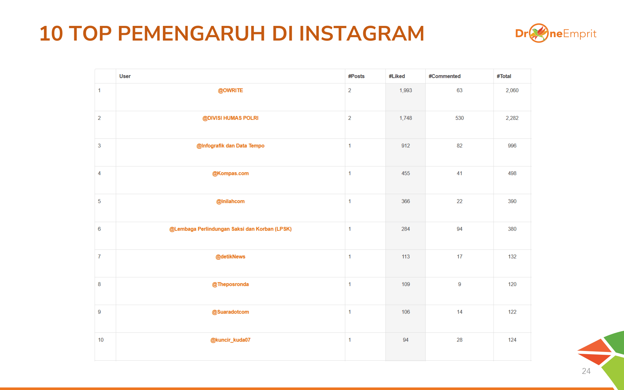 Instagram didominasi oleh konten infografis edukatif dan rilis resmi. Akun @OWRITE dan @DIVISIHUMASPOLRI menjadi sumber utama bagi audiens yang mencari rangkuman kasus secara visual dan kredibel.