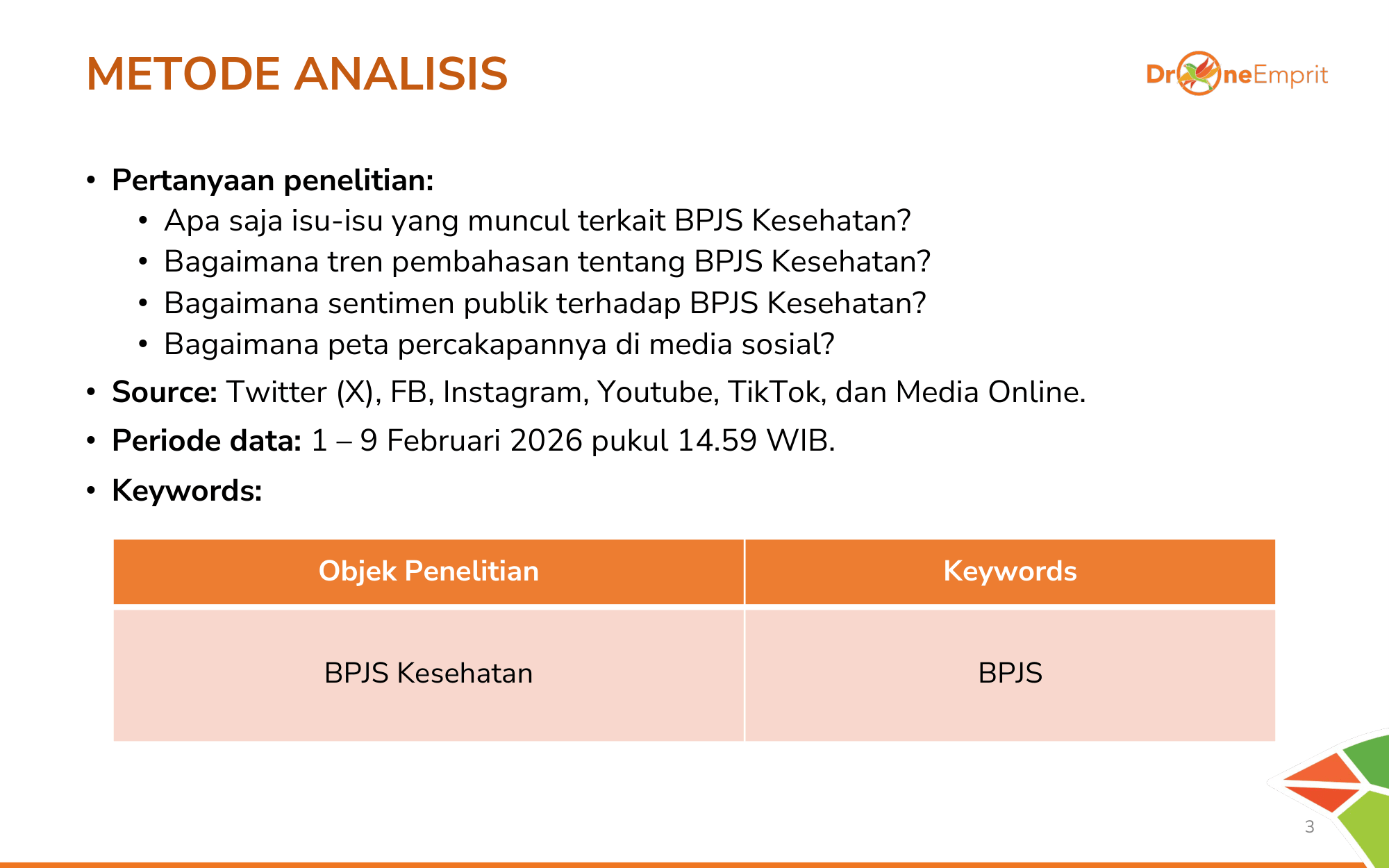 Kami memantau isu ini di berbagai platform (X, FB, IG, TikTok, YouTube, News) periode 1-9 Februari 2026. Fokus pada tren, sentimen, dan peta percakapan dengan kata kunci "BPJS".