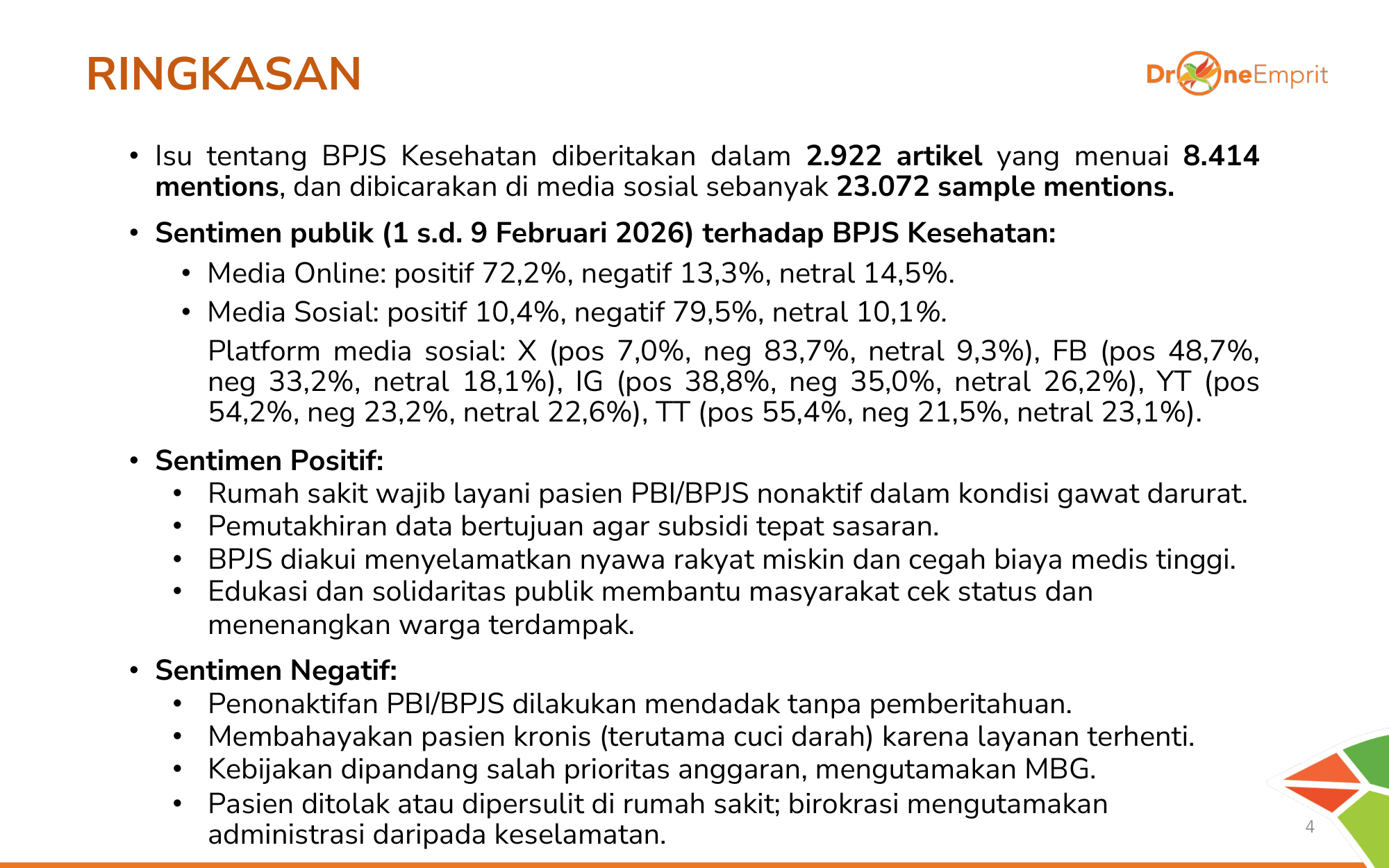 Ada 2.922 artikel dan puluhan ribu percakapan medsos. Berita online cenderung positif (72,2%) menyoroti solusi reaktivasi, tapi medsos sangat negatif (79,5%) karena keluhan pasien ditolak RS.