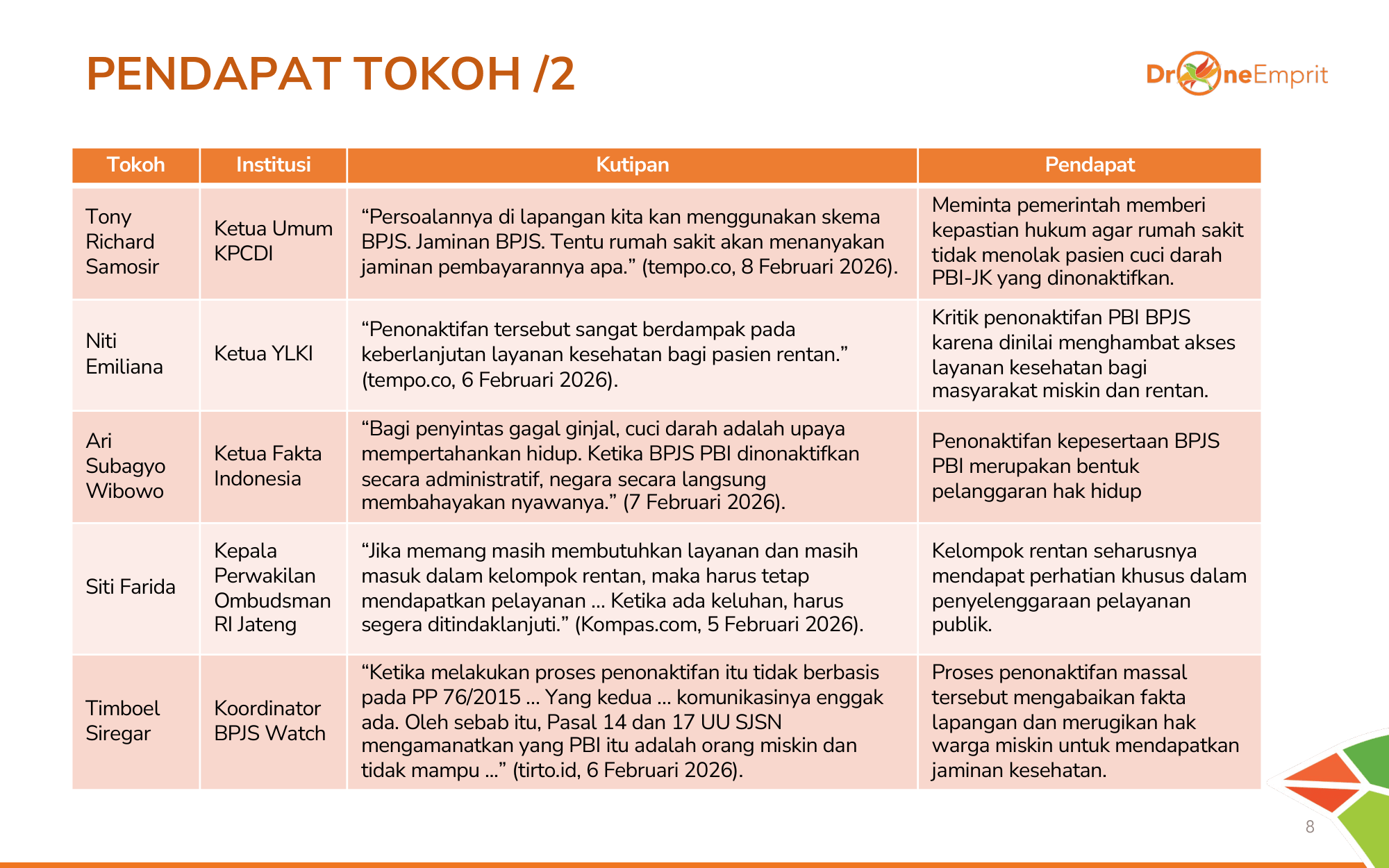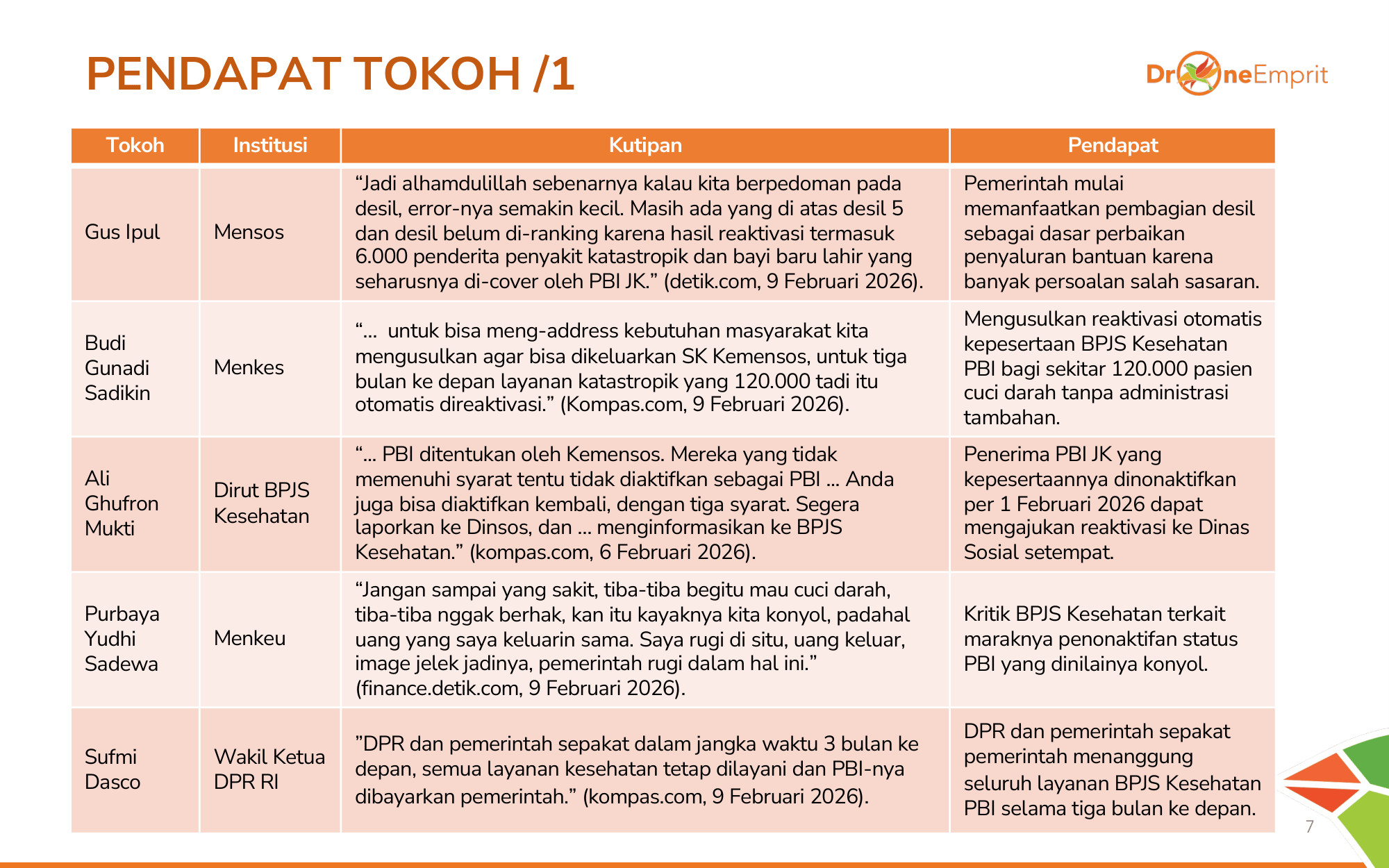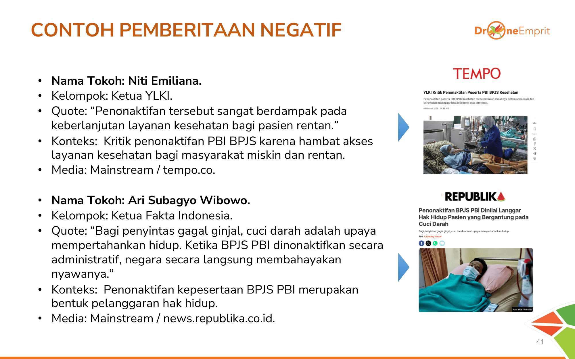 Sisi positif diwakili pernyataan Gus Ipul soal perbaikan data desil agar bantuan tepat sasaran, serta Humas BPJS yang menjamin adanya mekanisme reaktivasi bagi peserta yang memenuhi syarat.