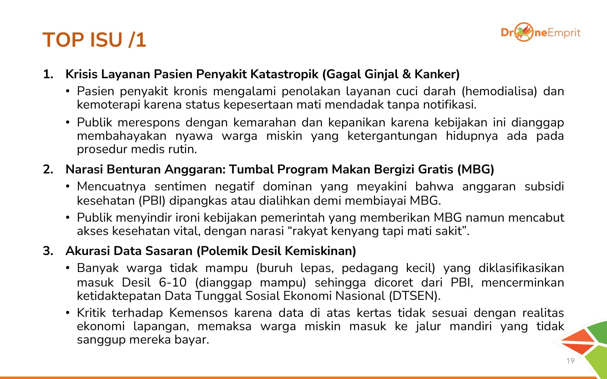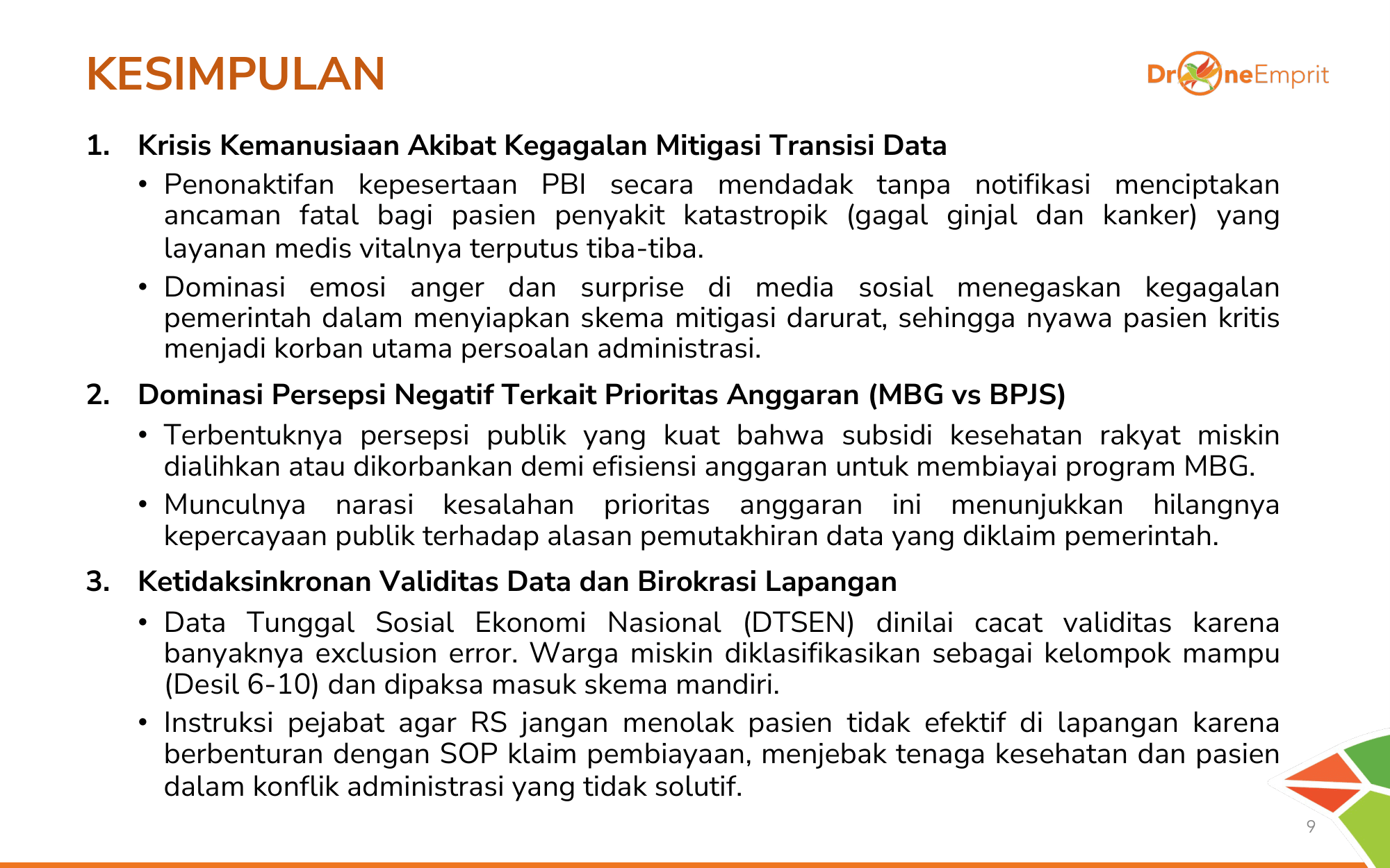 Kesimpulannya: Terjadi krisis kemanusiaan akibat minimnya mitigasi transisi data. Persepsi publik meyakini prioritas anggaran kesehatan tergeser program lain. Ditambah, ketidaksinkronan data dan aturan lapangan memperparah situasi.
