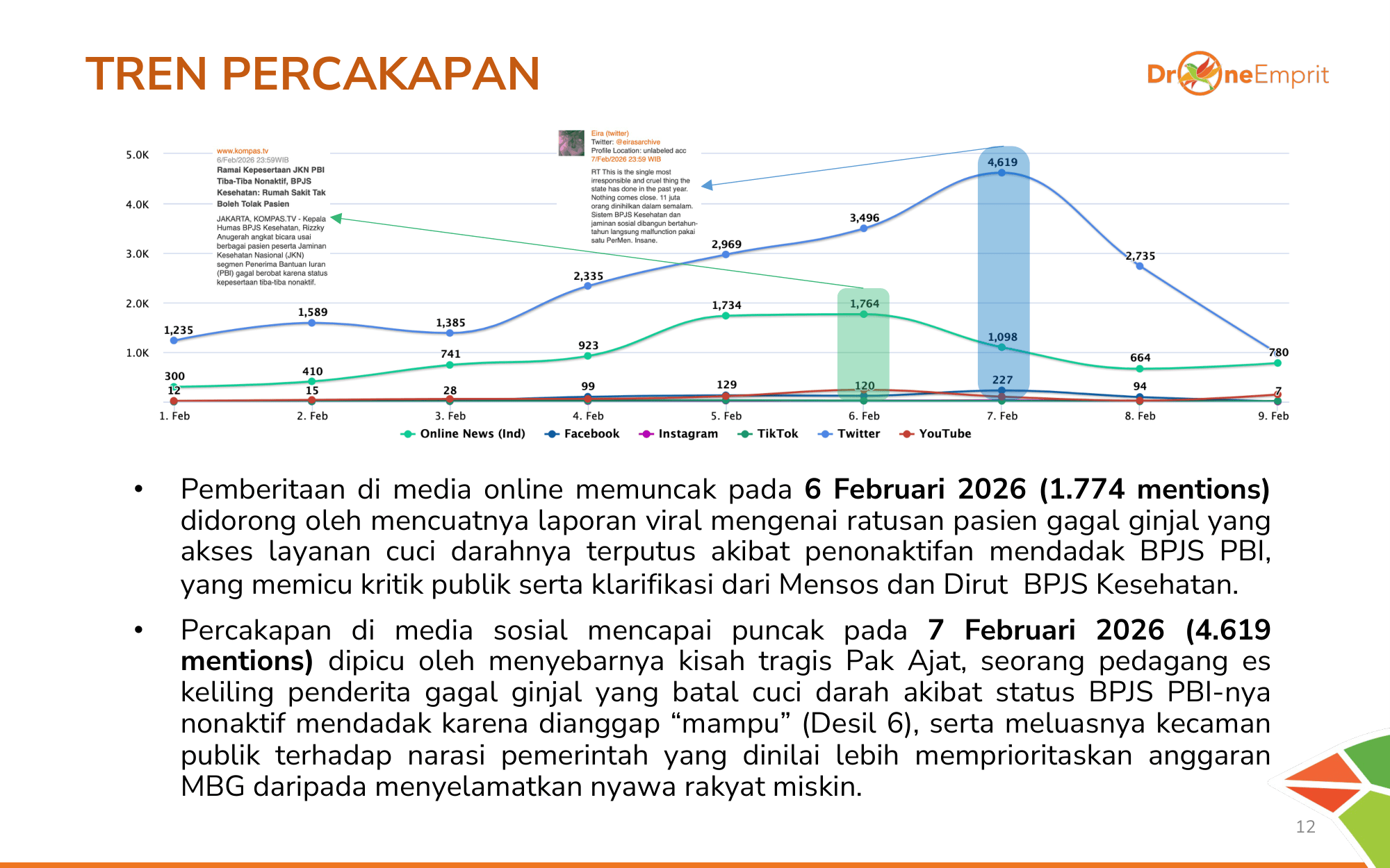 Berita memuncak 6 Februari saat laporan pasien gagal ginjal mencuat. Di medsos, puncak terjadi 7 Februari dipicu kisah viral pedagang es yang batal cuci darah dan narasi kritik prioritas anggaran negara.