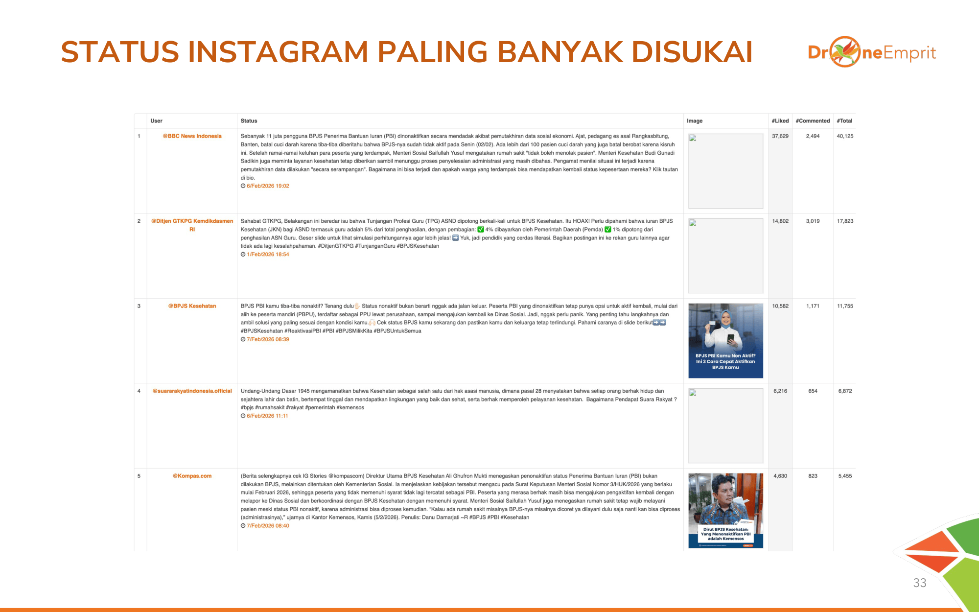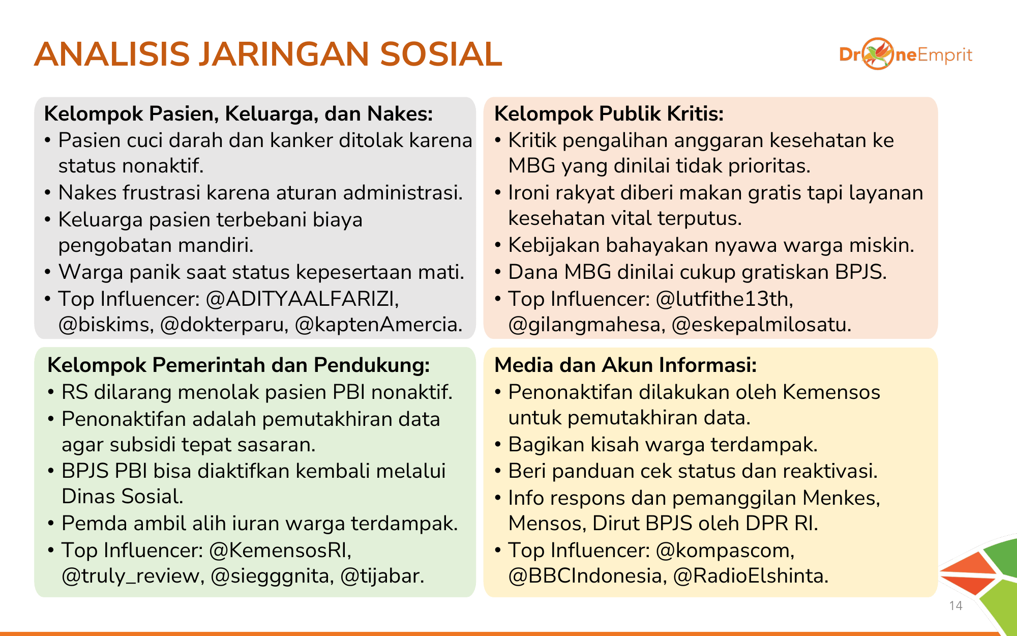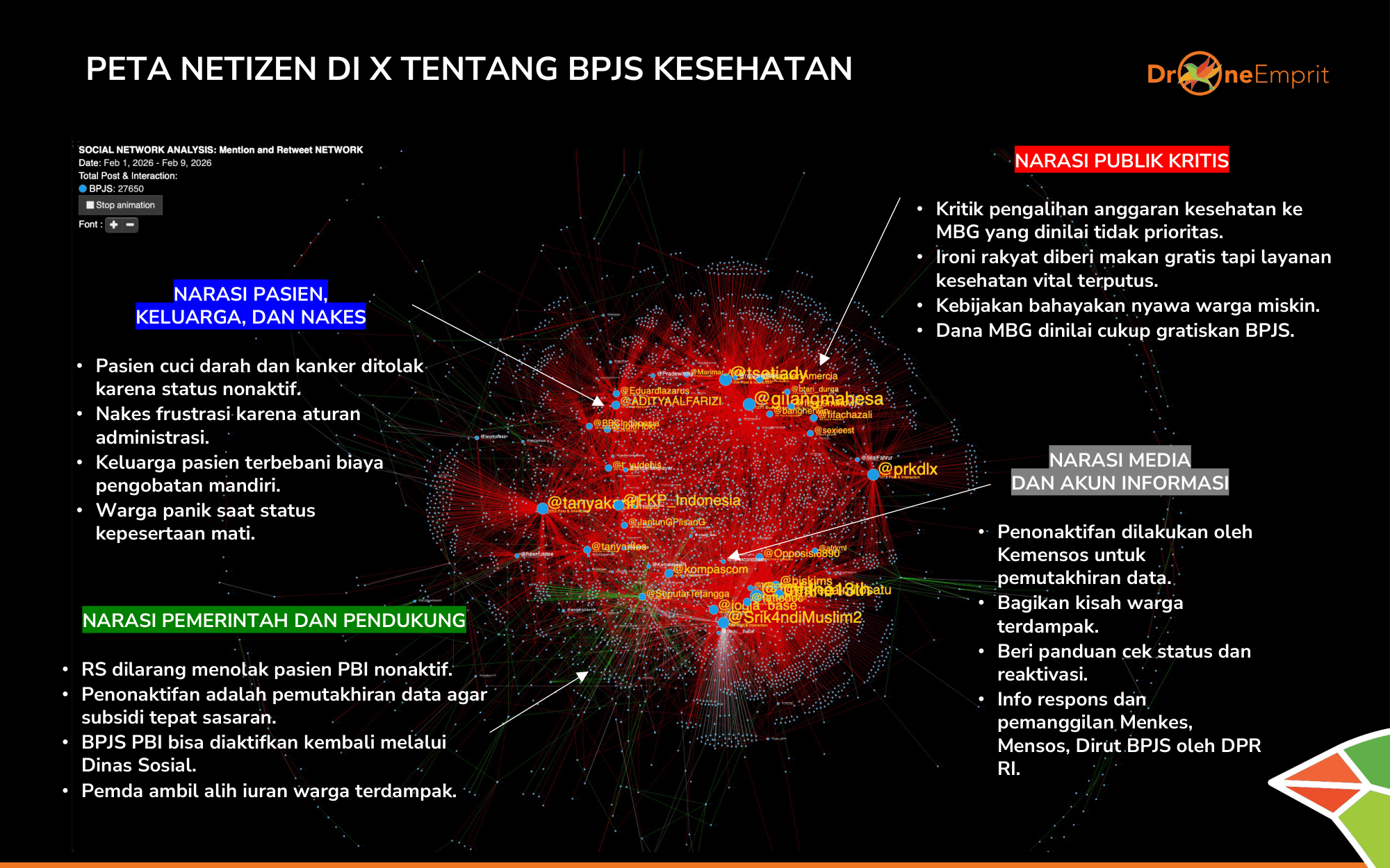 Influencer nakes dan pasien vokal menyuarakan fakta lapangan. Akun publik kritis mendominasi narasi anggaran. Akun pemerintah dan media fokus pada sosialisasi solusi. Tiap kelompok punya resonansi kuat.