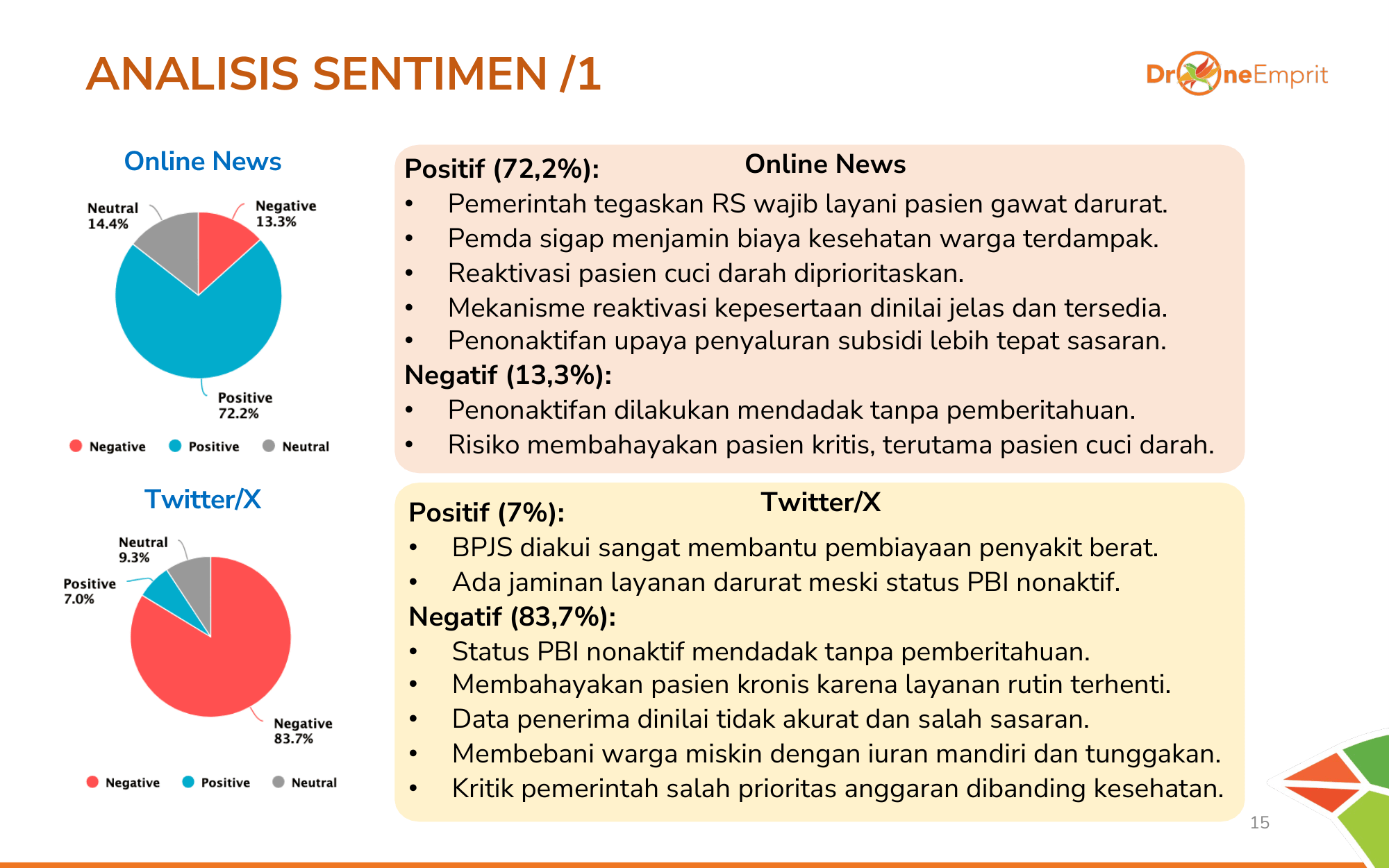 Media online 72,2% positif karena memuat jaminan layanan darurat. Kontras dengan Twitter (X) yang 83,7% negatif, dipenuhi amarah soal penonaktifan mendadak dan beban biaya mandiri bagi warga miskin.