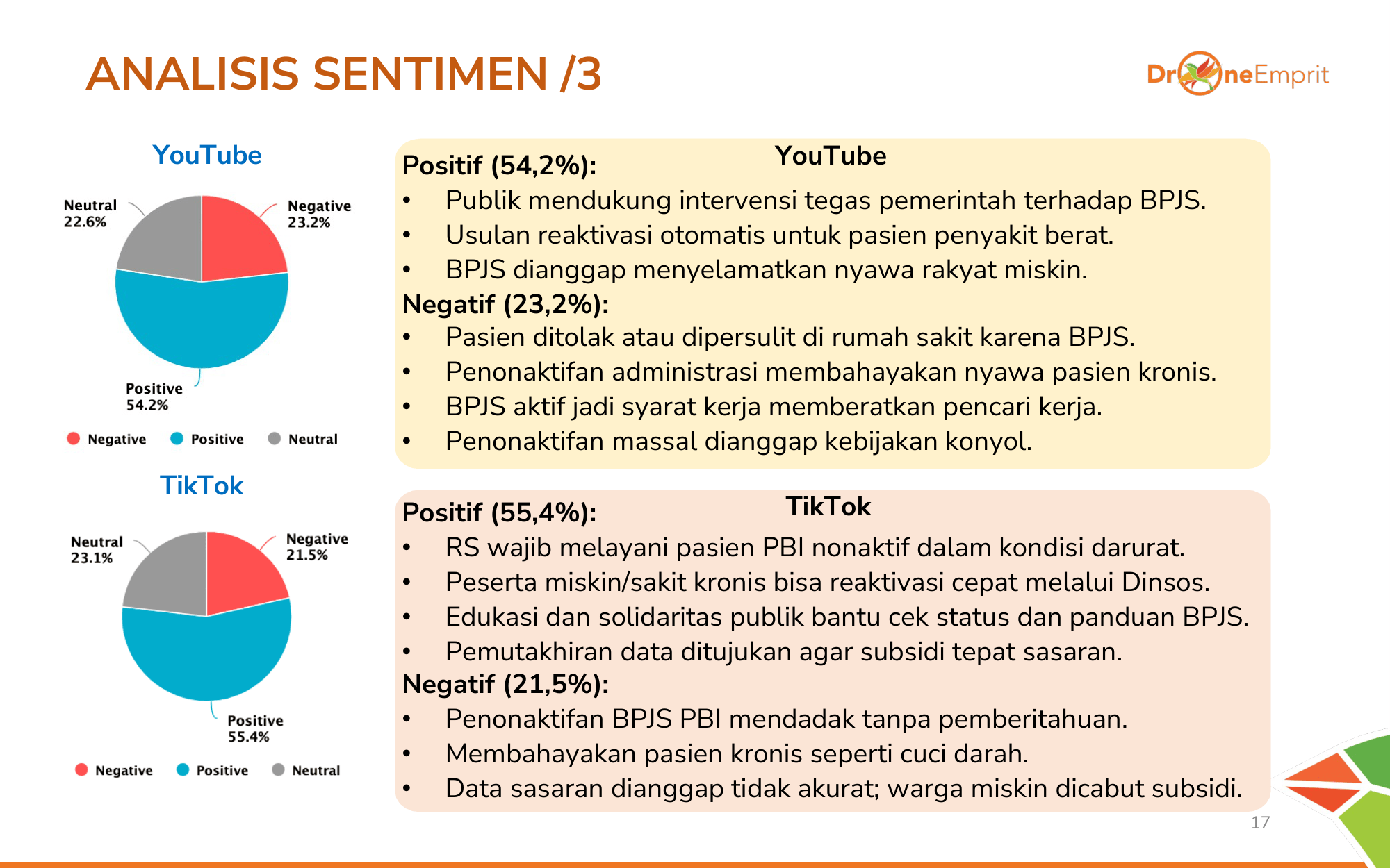 YouTube dan TikTok cenderung positif (>50%) merespons dukungan intervensi pemerintah dan edukasi reaktivasi. Namun, kritik tetap tajam soal syarat kerja (BPJS aktif) dan penolakan pasien di lapangan.