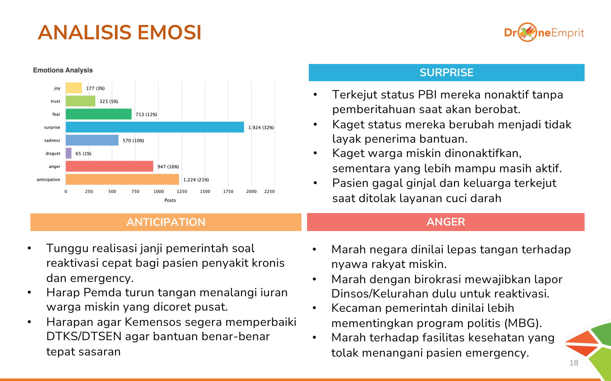 'Surprise' (kaget) karena status mati mendadak. 'Anger' (marah) pada birokrasi yang dinilai abai nyawa rakyat. 'Anticipation' (harap) menunggu solusi pemerintah dan perbaikan data agar bantuan tepat sasaran.
