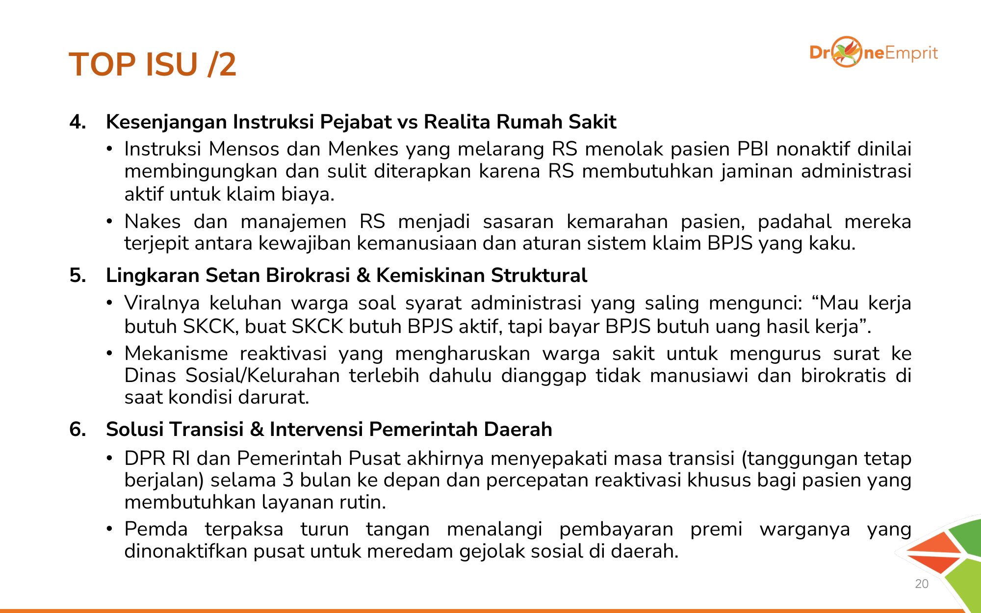 Terjadi polarisasi tajam antara agenda media dan realitas netizen. Validitas data kemiskinan (DTSEN) dipertanyakan karena banyak warga miskin terdepak. Birokrasi pun menjebak: butuh BPJS aktif untuk kerja, tapi butuh kerja untuk bayar BPJS.