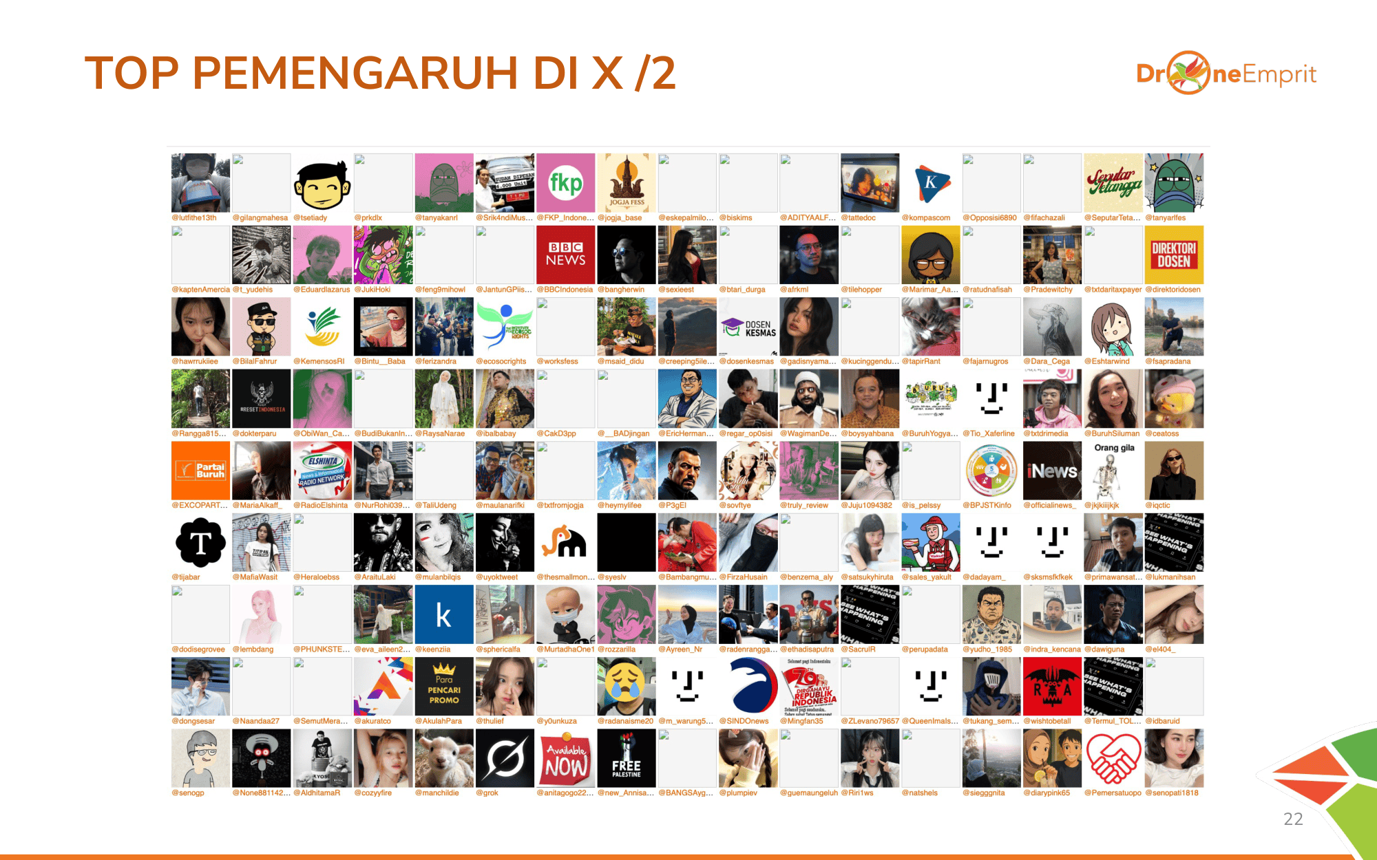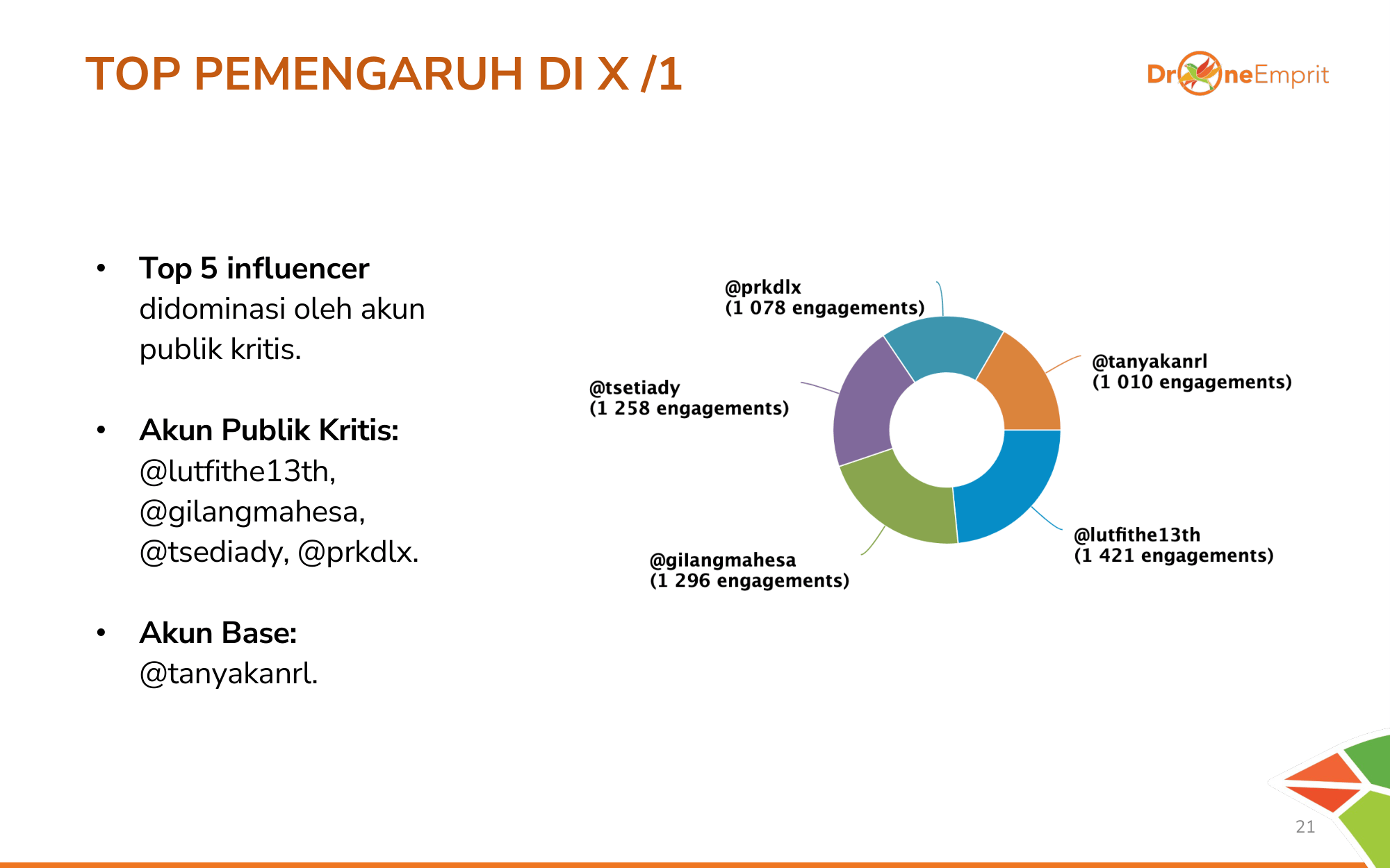 Di platform X, 5 besar pemengaruh didominasi oleh akun publik kritis dan akun basis komunitas (base) yang vokal menyuarakan keresahan warga dan kritik kebijakan.
