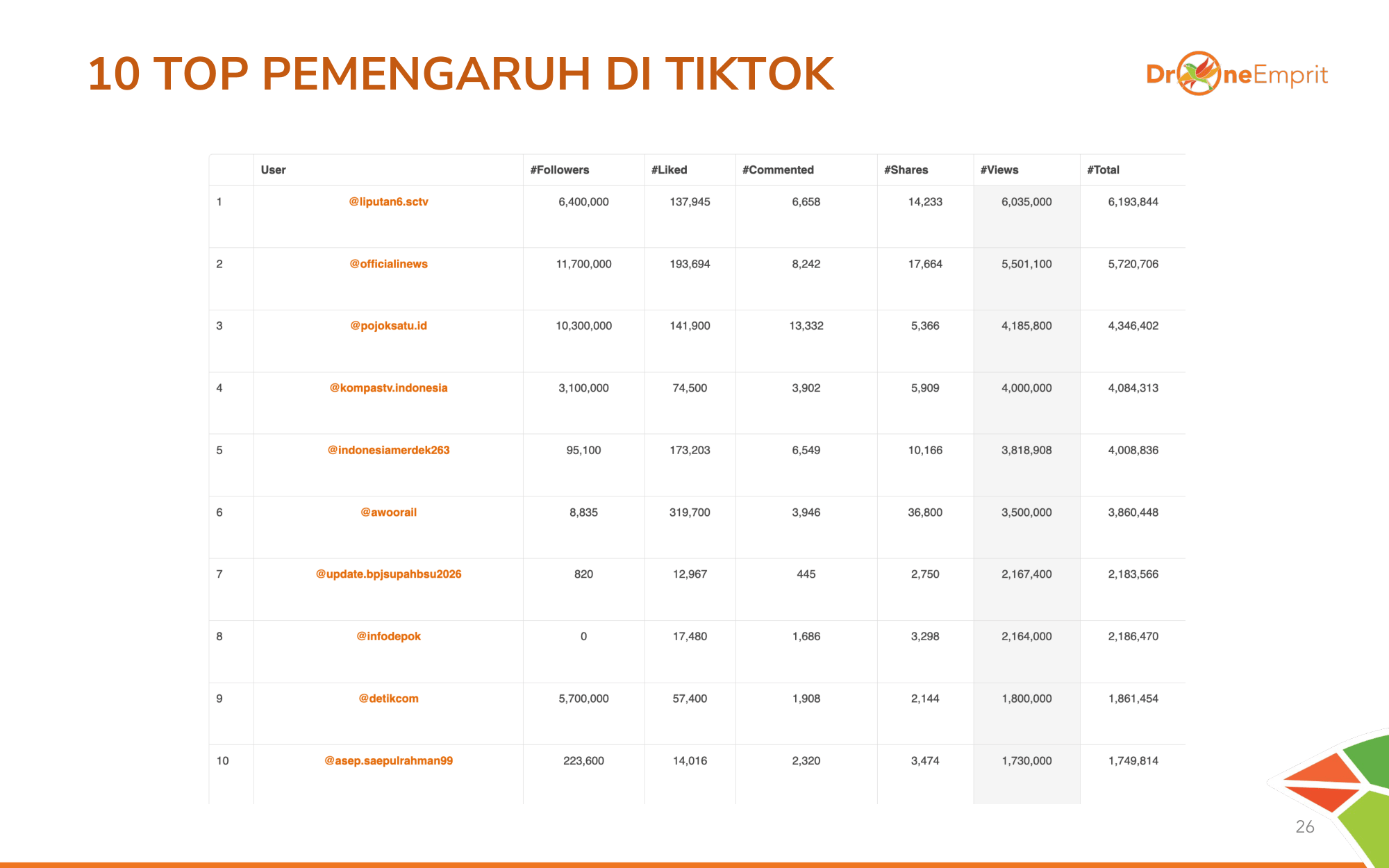 Akun berita seperti Liputan6 dan iNews sangat dominan di TikTok dengan jutaan views. Konten "fypp" berisi potongan berita dan keluhan warga cepat viral di sini.