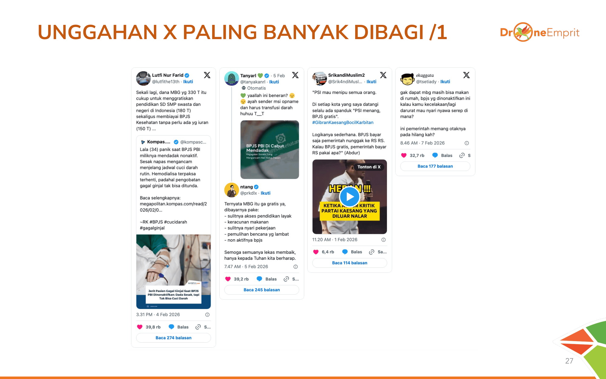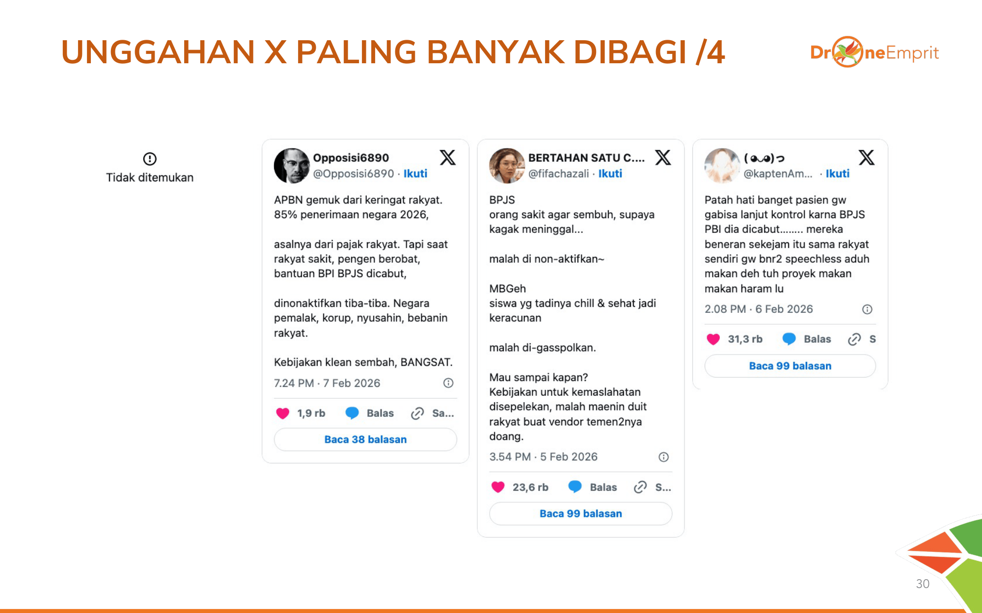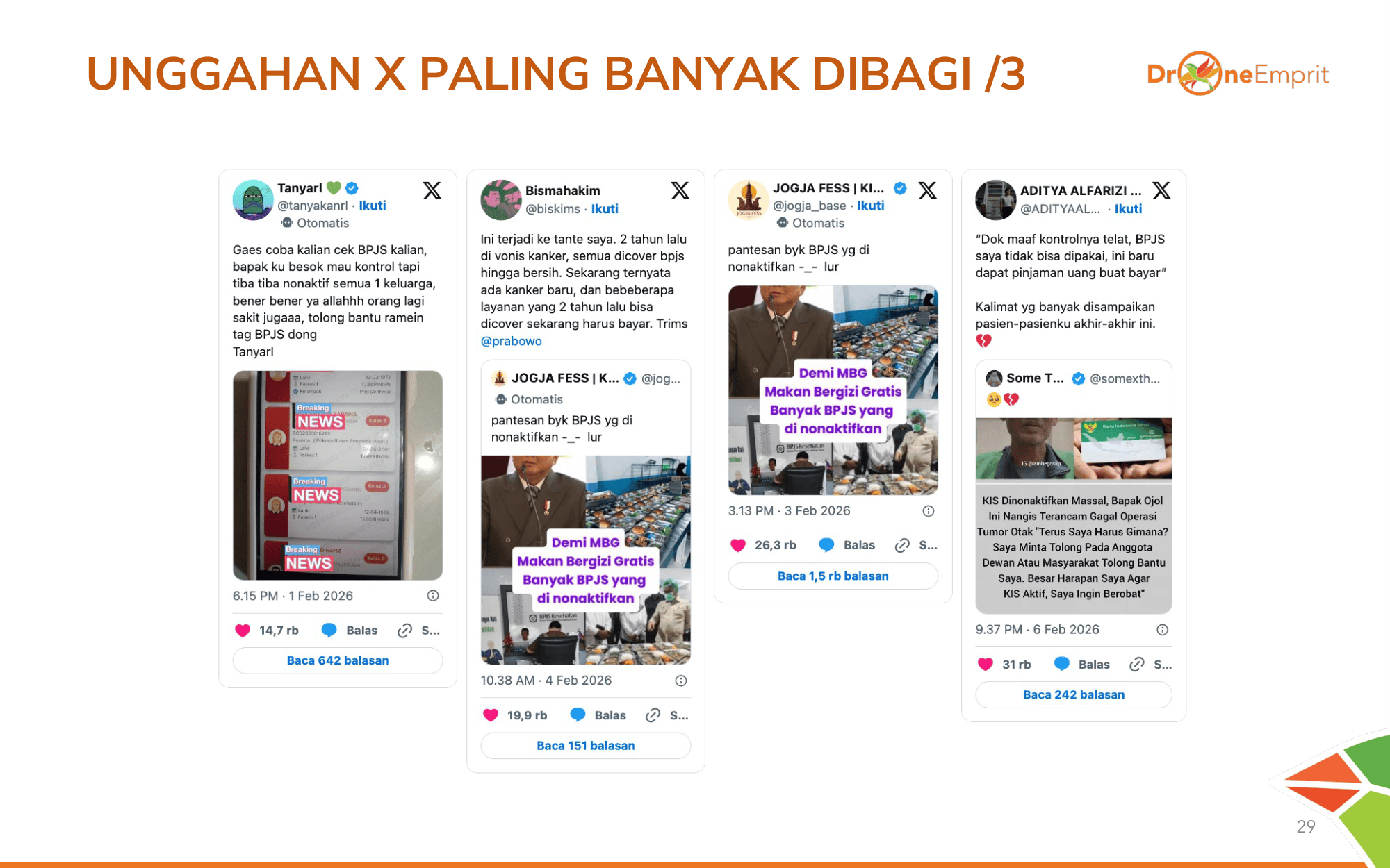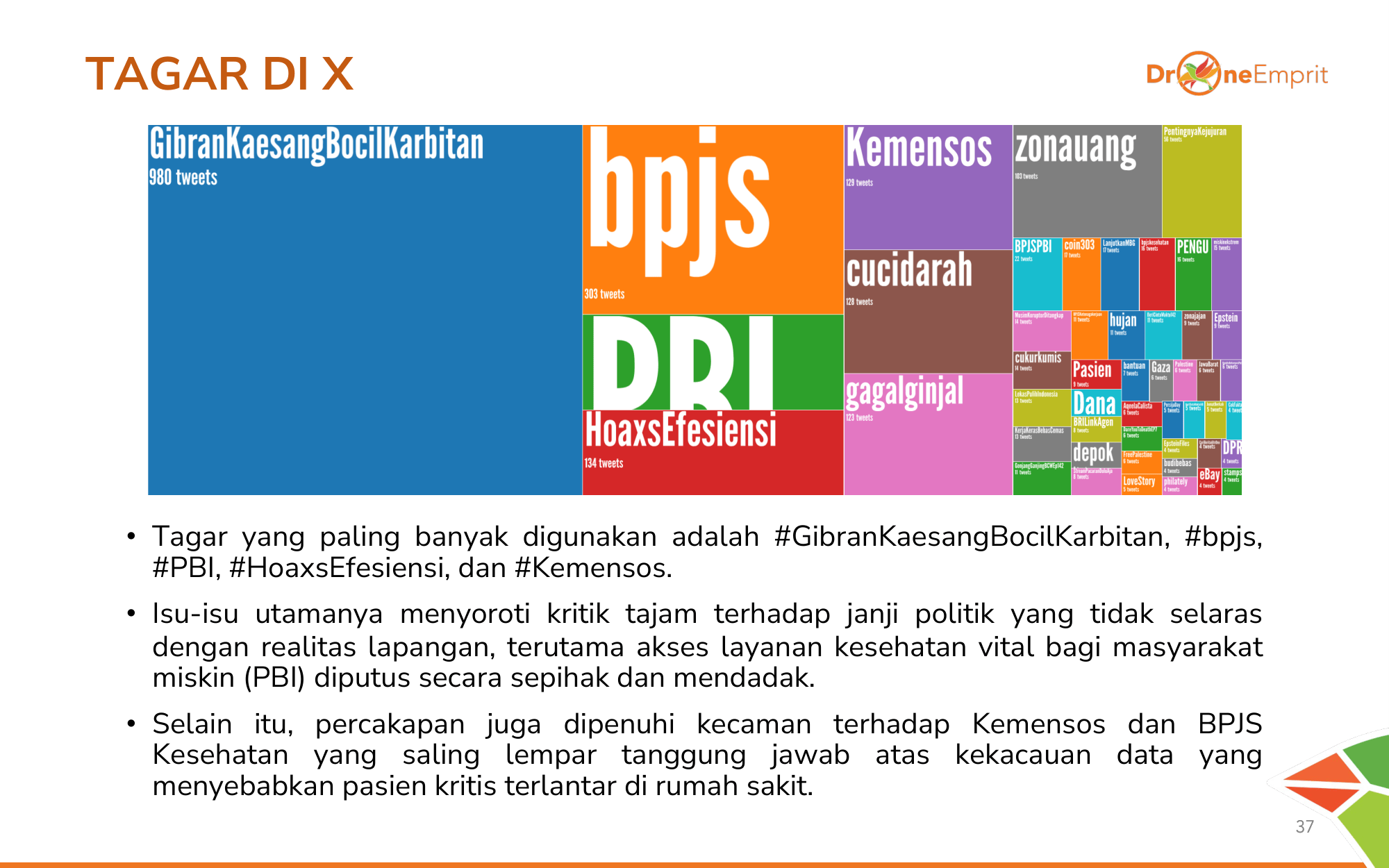 Tagar #BPJS dan #PBI standar, namun muncul tagar kritikan seperti #HoaxsEfesiensi dan tagar politik yang menyindir janji kampanye. Sasaran tembak netizen jelas: Kemensos dan kebijakan anggaran.