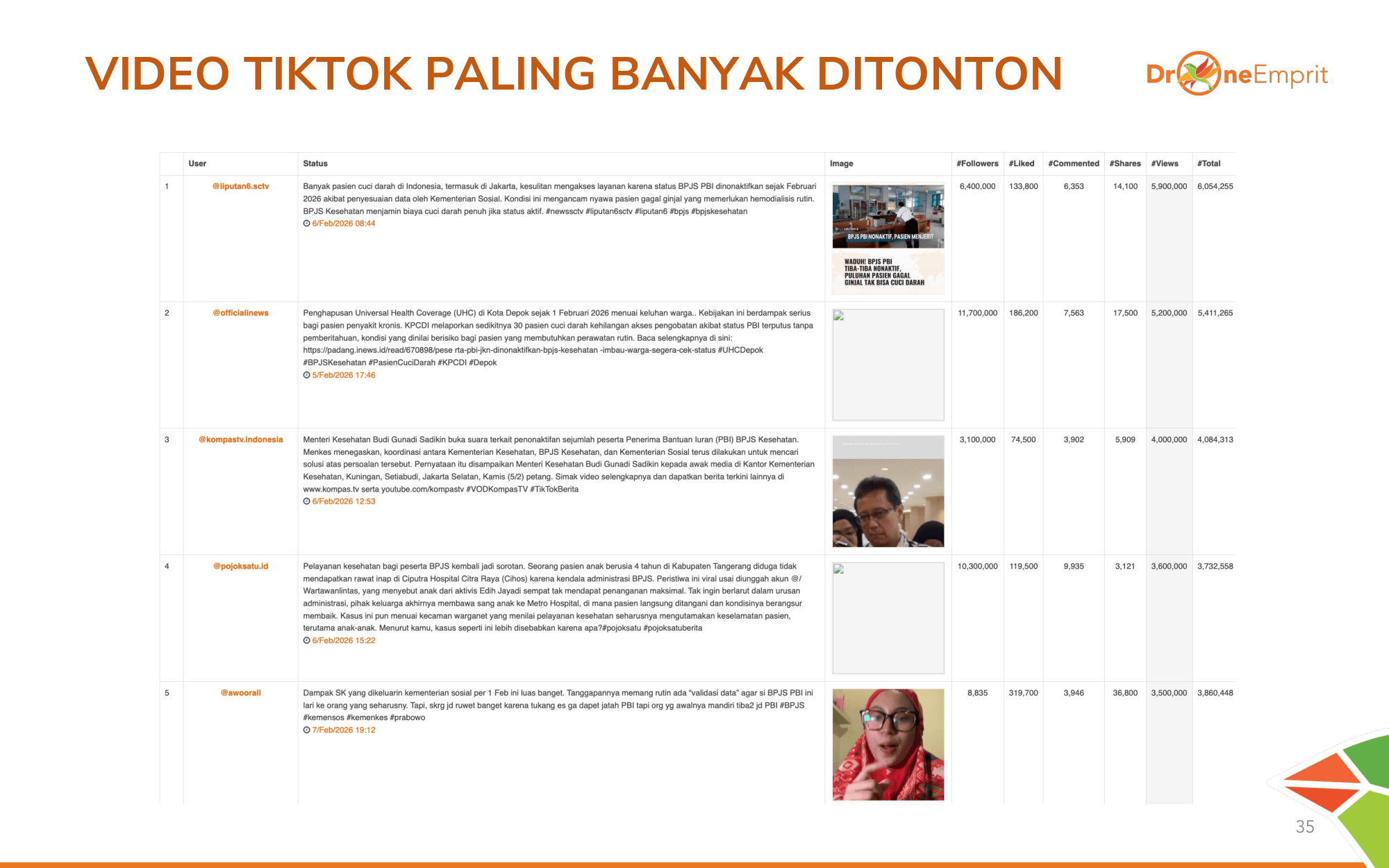 TikTok didominasi potongan berita soal ancaman nyawa pasien cuci darah dan pernyataan Menkeu soal "kegaduhan publik". Audiens merespons dengan simpati tinggi pada korban kebijakan.