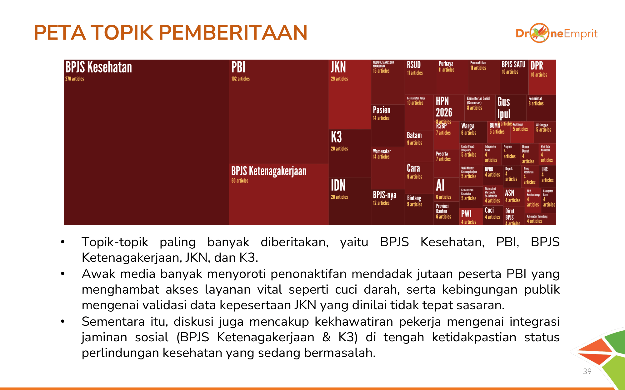 Fokus utama media adalah BPJS Kesehatan dan PBI (penonaktifan). Namun, isu melebar ke BPJS Ketenagakerjaan (JKN/K3) terkait nasib pekerja yang juga cemas soal jaminan sosial mereka.