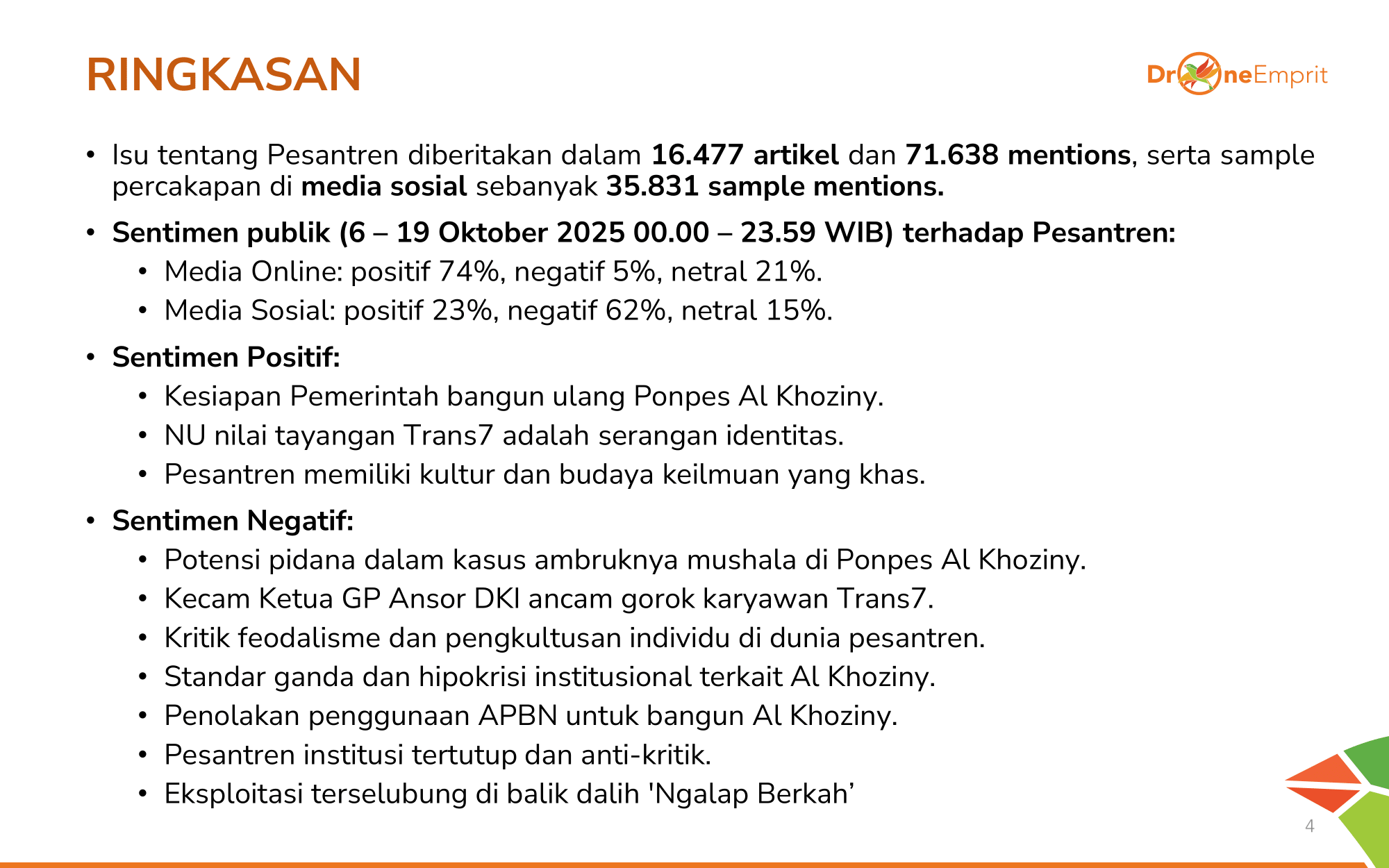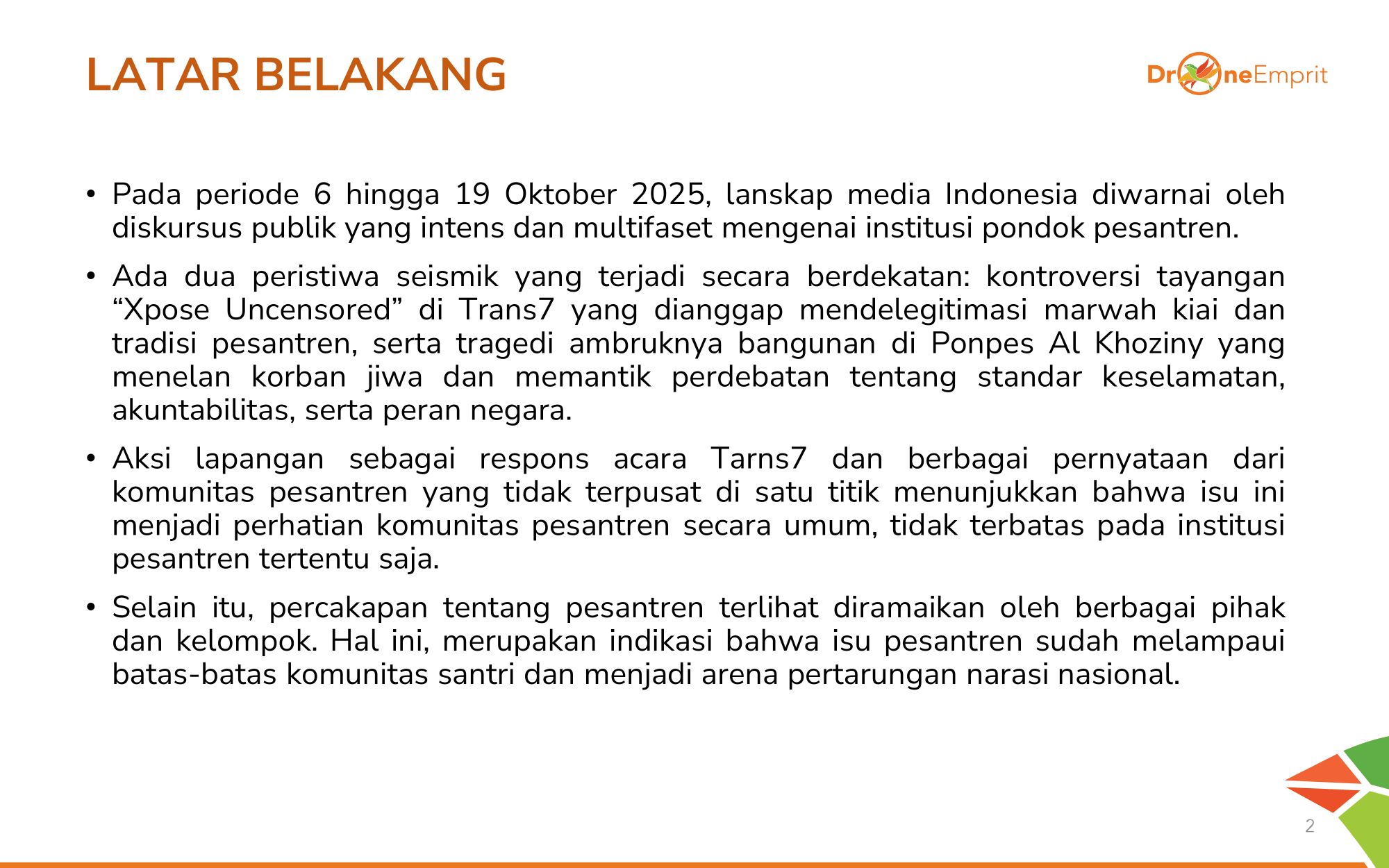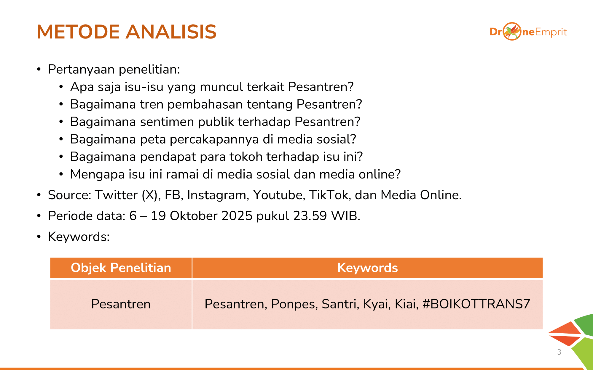 Dengan 6 pertanyaan riset, kami menambang data dari media sosial & online (6-19 Okt) menggunakan kata kunci seperti "Pesantren" & "#BOIKOTTRANS7". Tujuannya, memetakan isu, sentimen, dan peta percakapan.