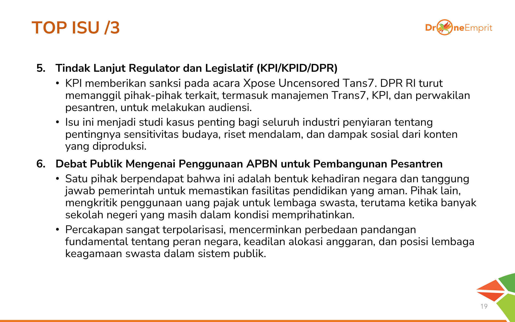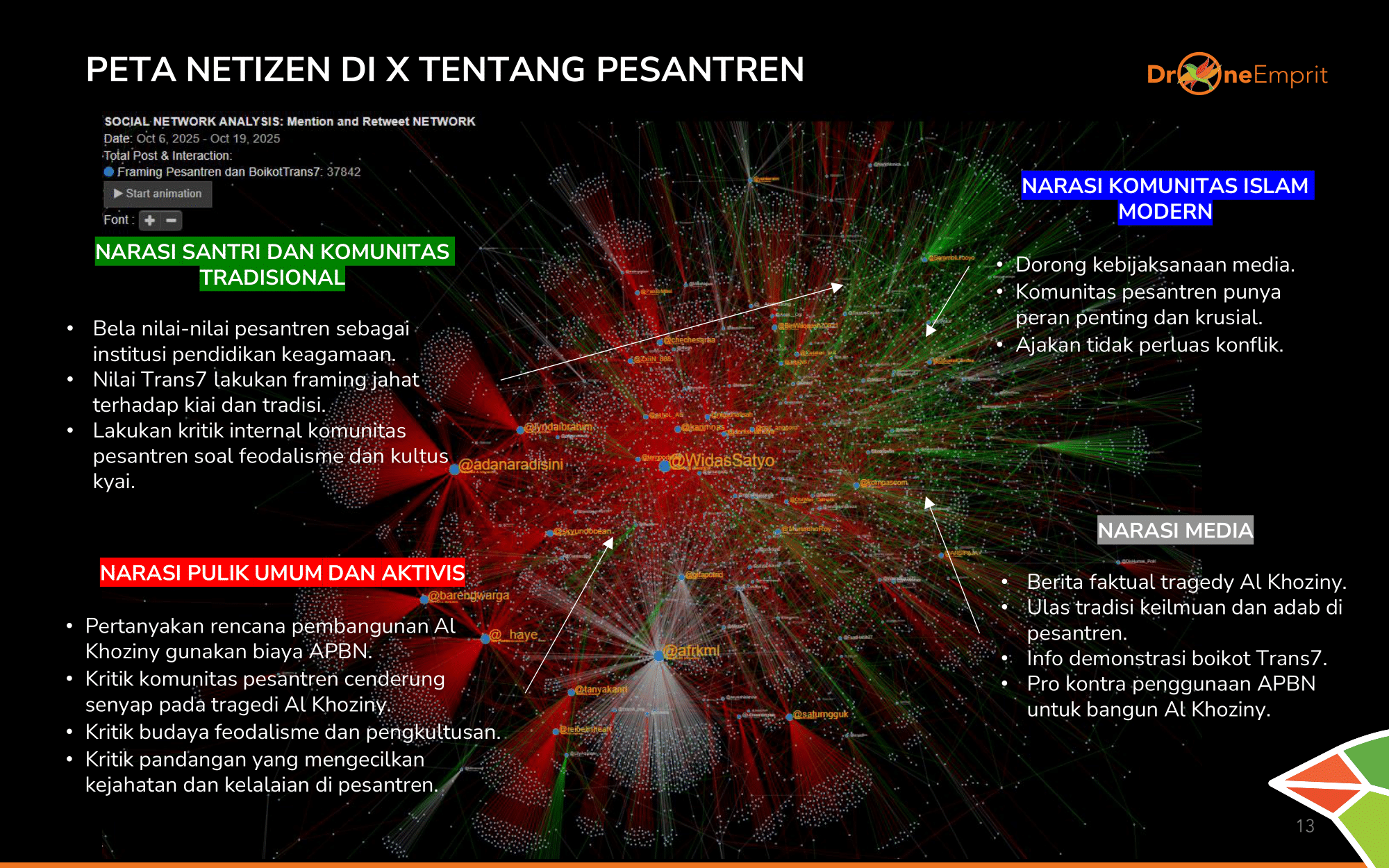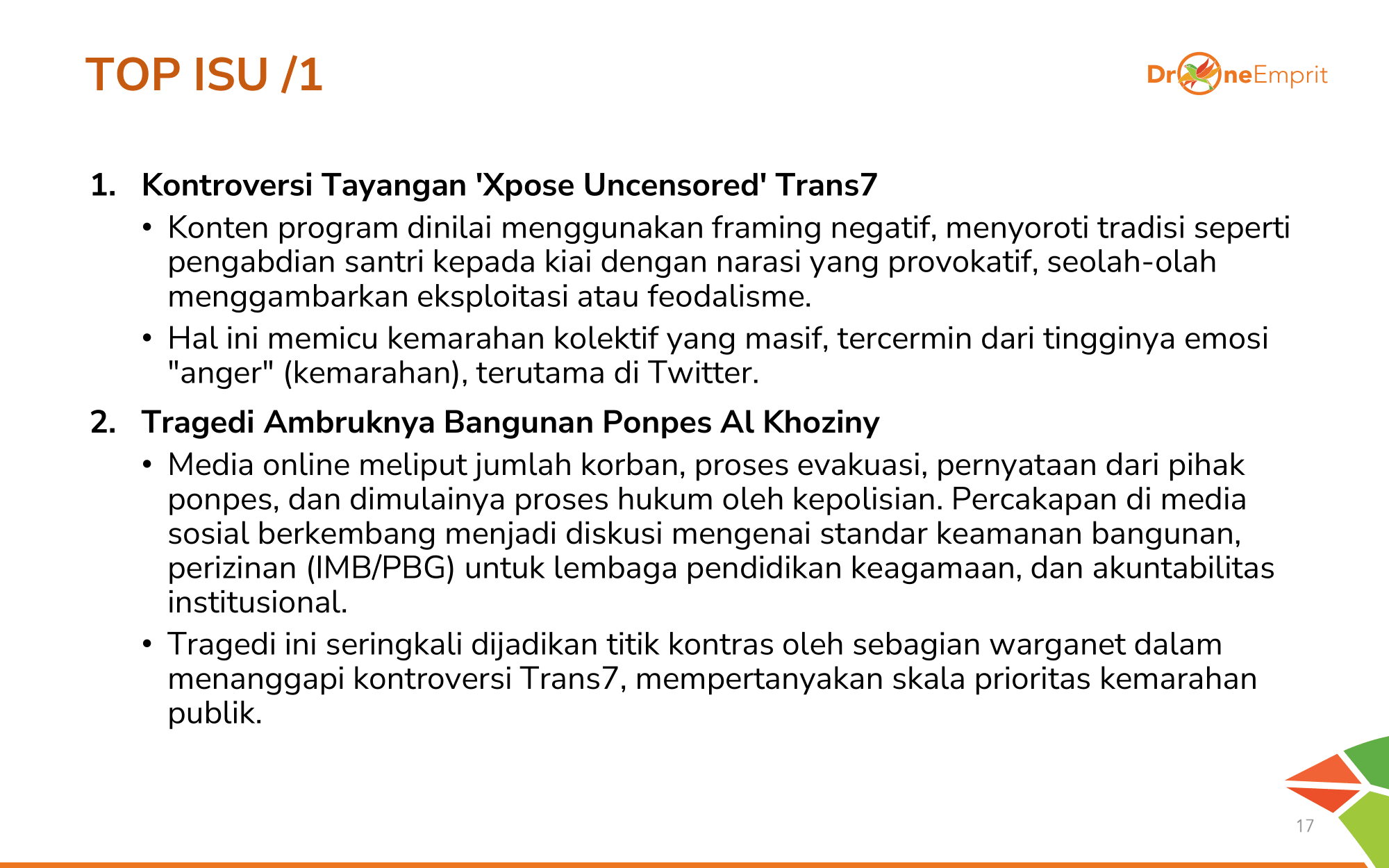 Dua isu utama menjadi pusat perhatian. Pertama, kontroversi framing negatif 'Xpose Uncensored' Trans7 yang memicu kemarahan kolektif. Kedua, tragedi ambruknya Ponpes Al Khoziny yang memantik diskursus soal akuntabilitas.