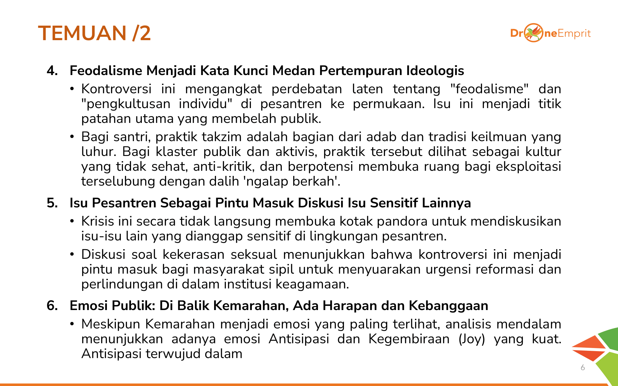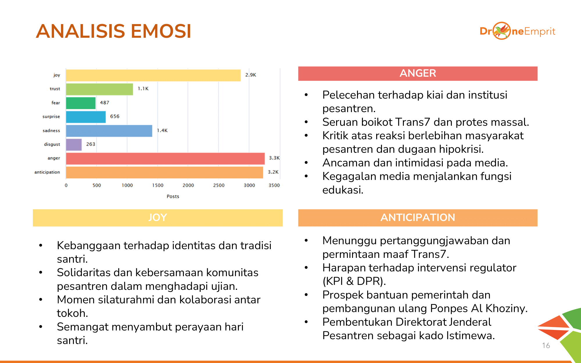 Kemarahan (Anger) menjadi emosi terkuat, dipicu oleh pelecehan terhadap kiai & kritik atas hipokrisi. Namun, ada juga kebahagiaan (Joy) atas solidaritas santri, serta penantian (Anticipation) terhadap pertanggungjawaban.