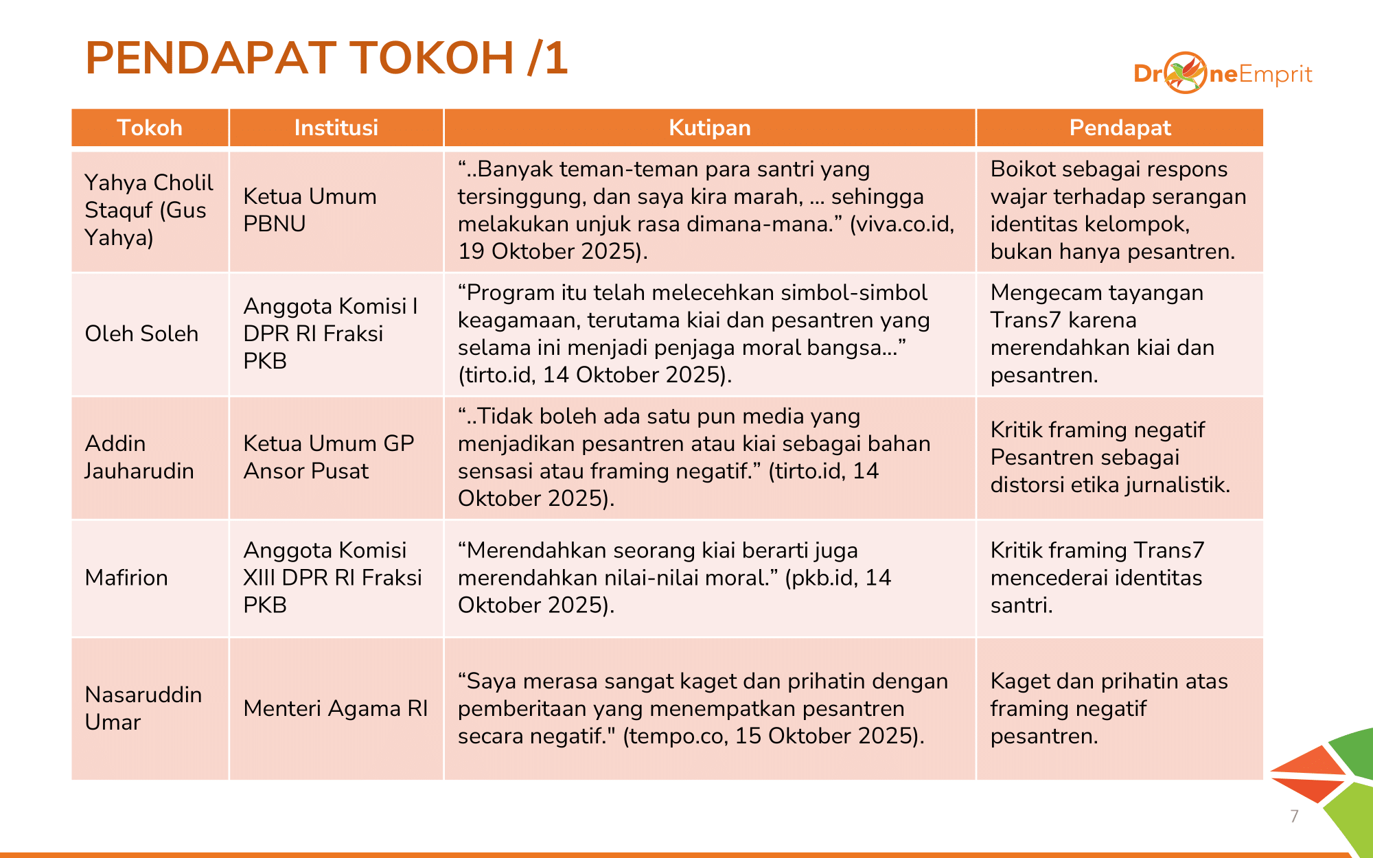 Para pimpinan NU, GP Ansor, hingga Menteri Agama menyuarakan keprihatinan atas framing negatif media. Mereka menilai tayangan Trans7 sebagai serangan identitas dan mencederai nilai luhur. Pihak Trans7 pun meminta maaf.
