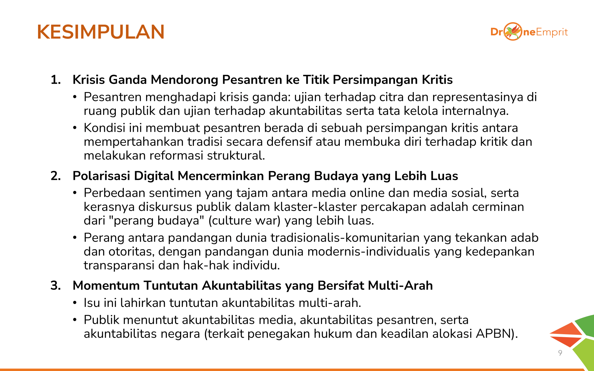Pesantren kini di persimpangan: hadapi krisis citra eksternal & tuntutan akuntabilitas internal. Polarisasi digital ini cerminkan "perang budaya" antara pandangan tradisionalis & modernis.