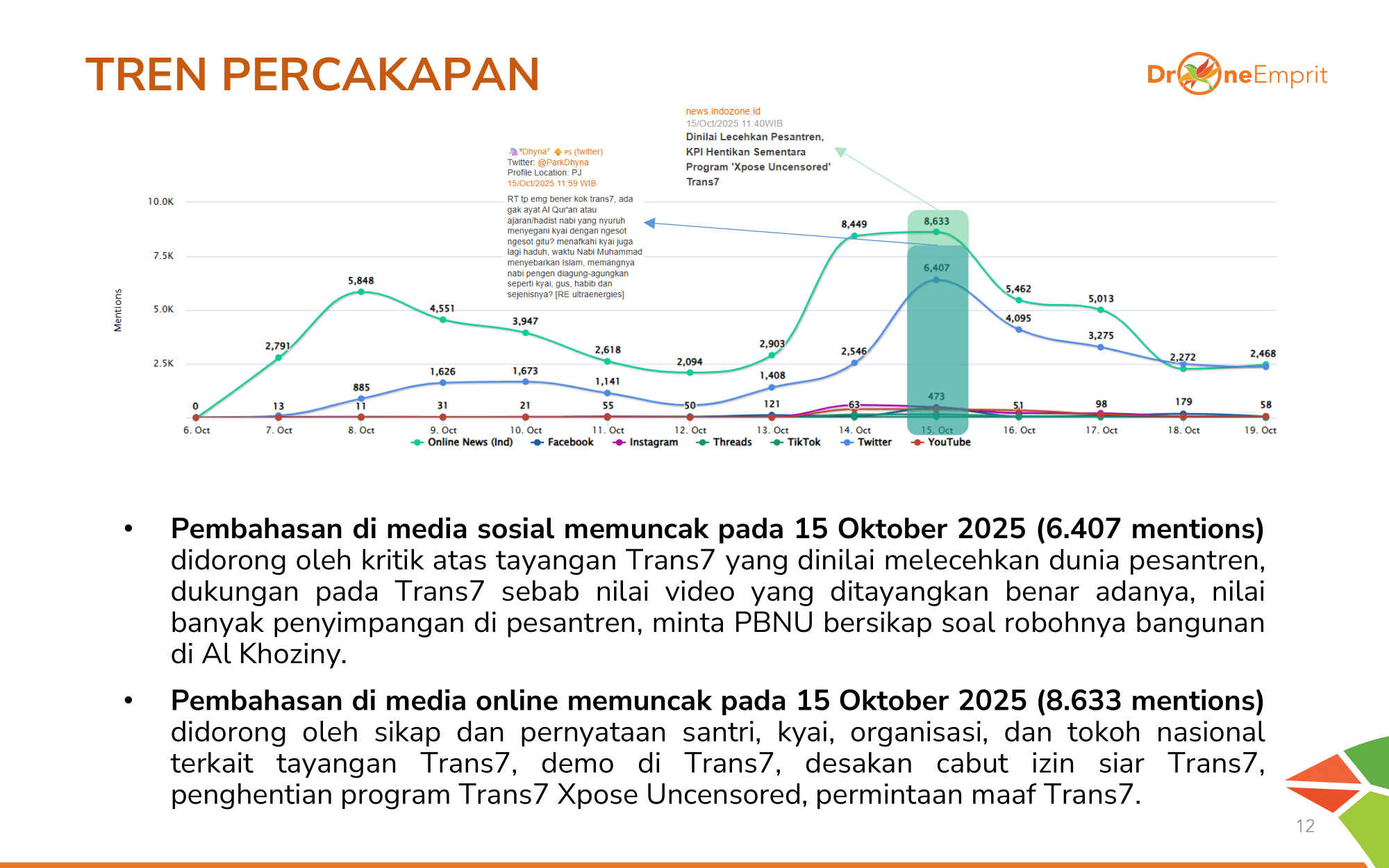 Puncak percakapan di media sosial dan online terjadi serentak pada 15 Oktober. Pemicunya adalah kritik terhadap Trans7, dukungan pada kontennya, serta desakan agar PBNU bersikap atas tragedi Al Khoziny.