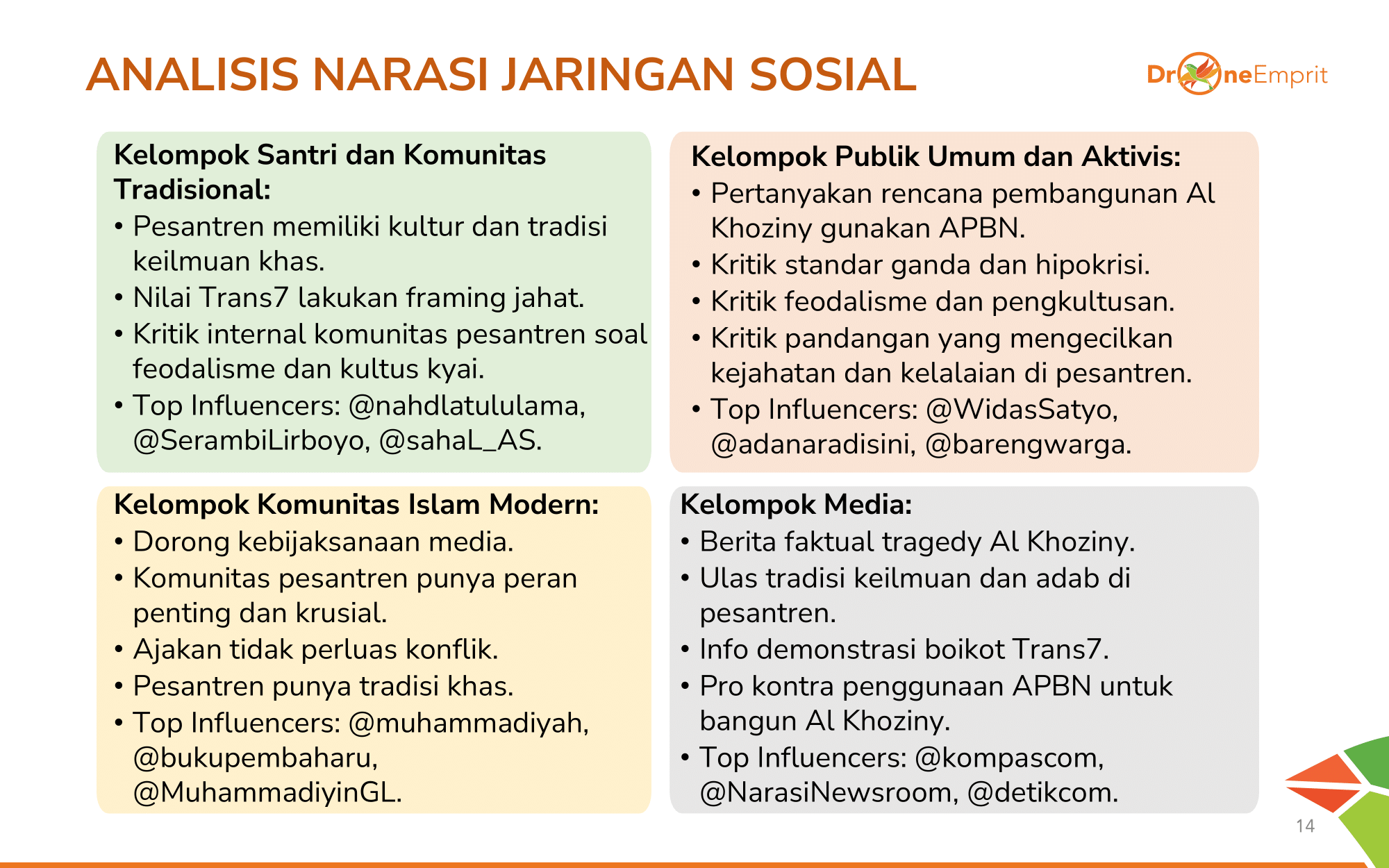Setiap kelompok punya narasi & influencer kunci. Komunitas santri dipimpin akun NU, sementara klaster kritis dipengaruhi aktivis. Kelompok moderat mendorong kebijaksanaan, & media fokus pada pemberitaan faktual.