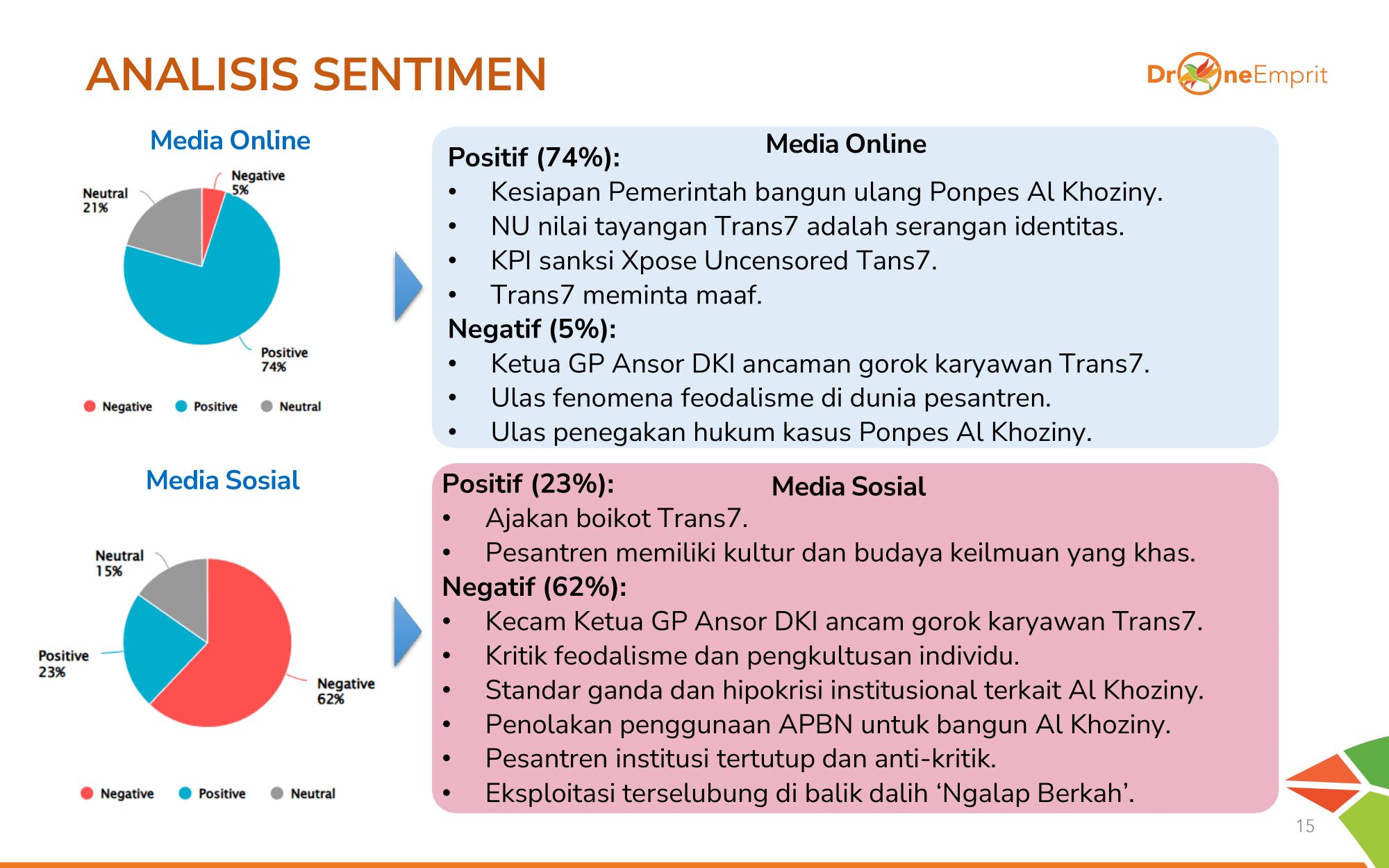 Di media online, sentimen positif (74%) didominasi berita kesiapan pemerintah & permintaan maaf Trans7. Sebaliknya, media sosial didominasi sentimen negatif (62%) yang mengkritik feodalisme & standar ganda.