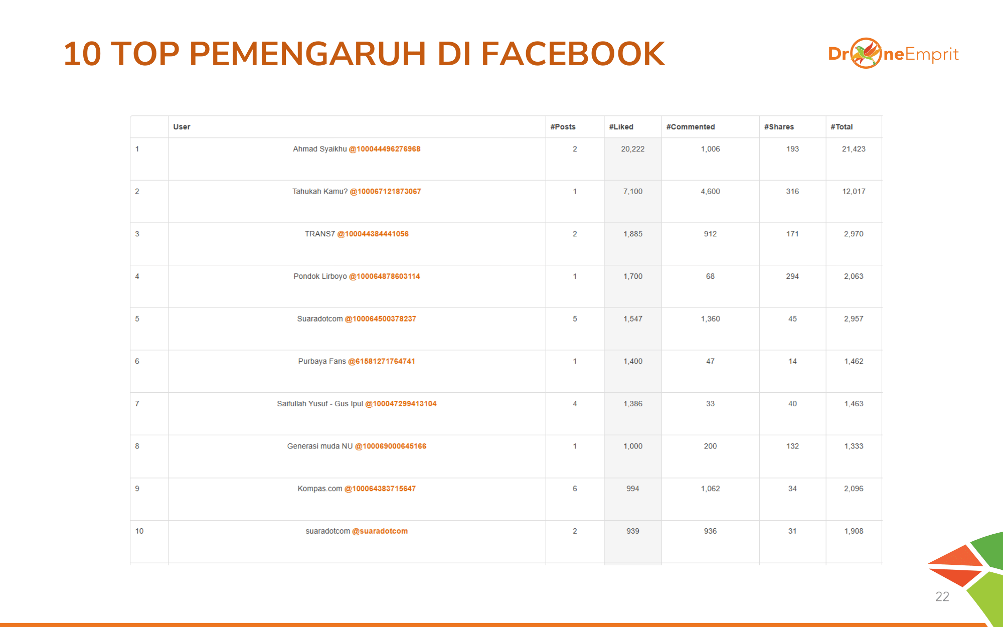 Di Facebook, narasi lebih beragam. Akun seperti Ahmad Syaikhu (positif) berdampingan dengan laman berita "Tahukah Kamu?" (negatif). Institusi seperti Trans7 & Pondok Lirboyo juga masuk dalam daftar pemengaruh utama.