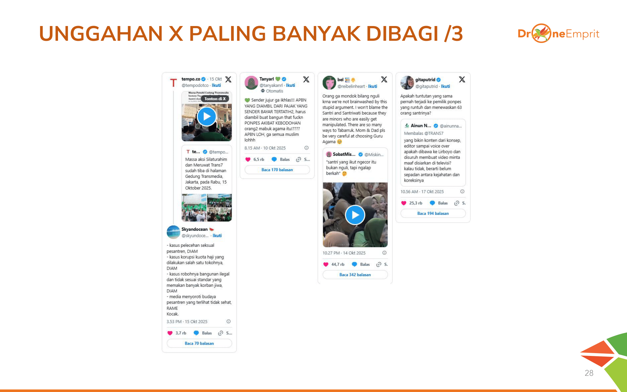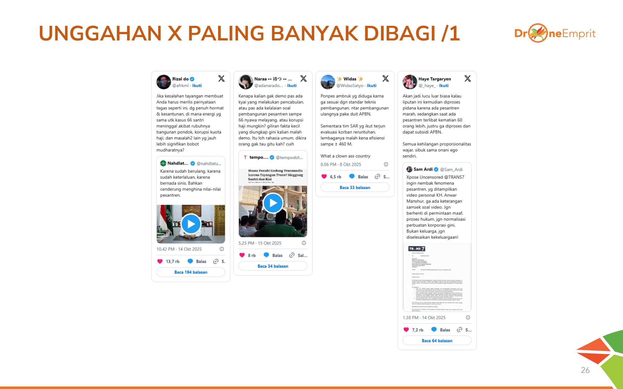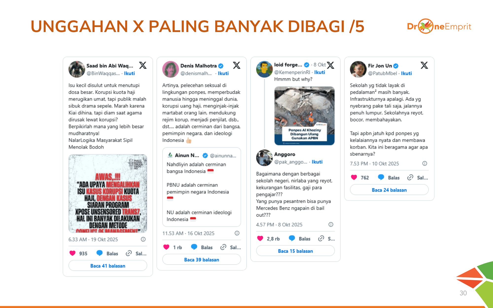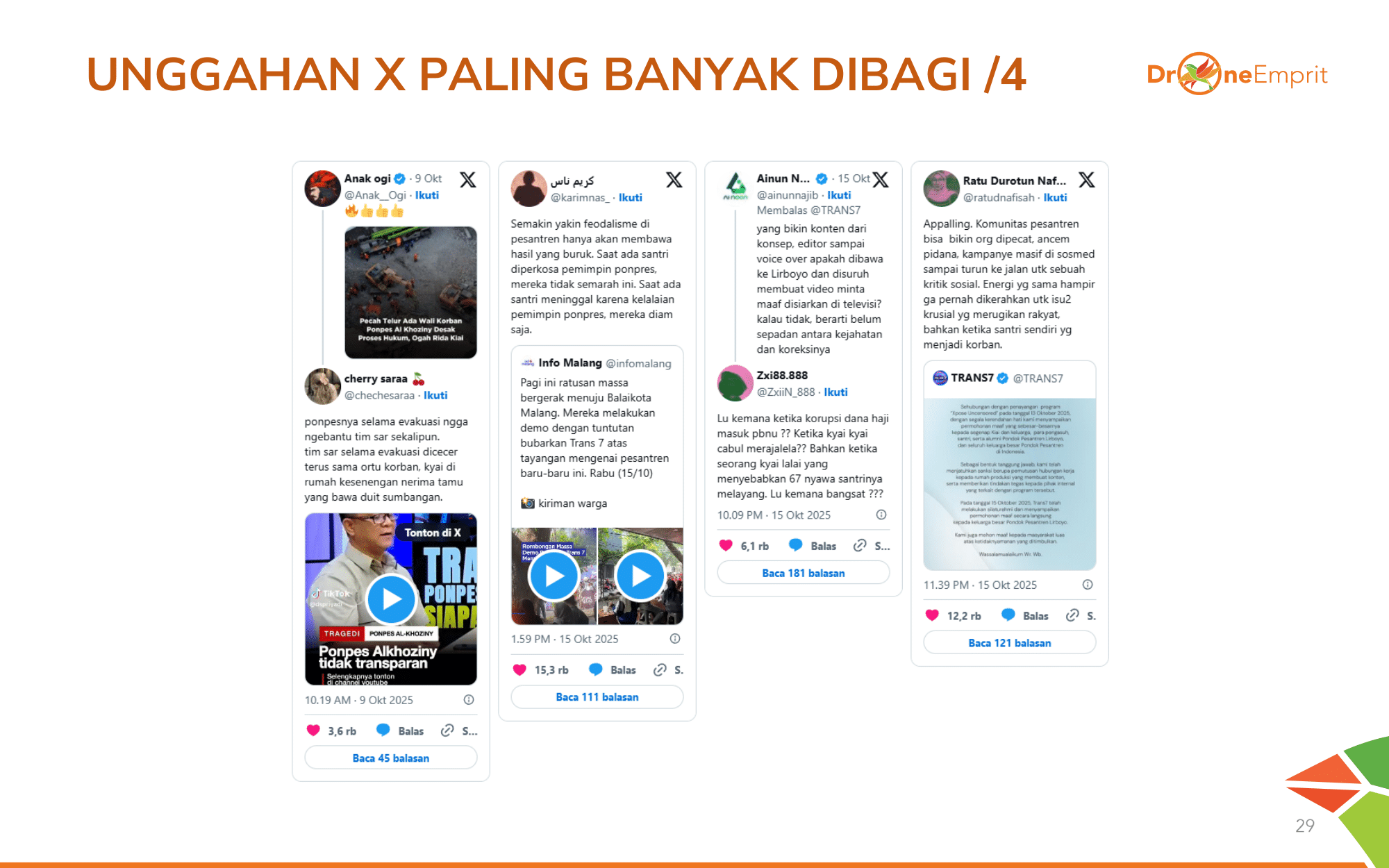 Unggahan teratas di X didominasi oleh narasi kritis. Akun bernarasi kritis mempertanyakan mengapa energi protes untuk Trans7 tidak sama besarnya untuk kasus Al Khoziny & isu internal lainnya.