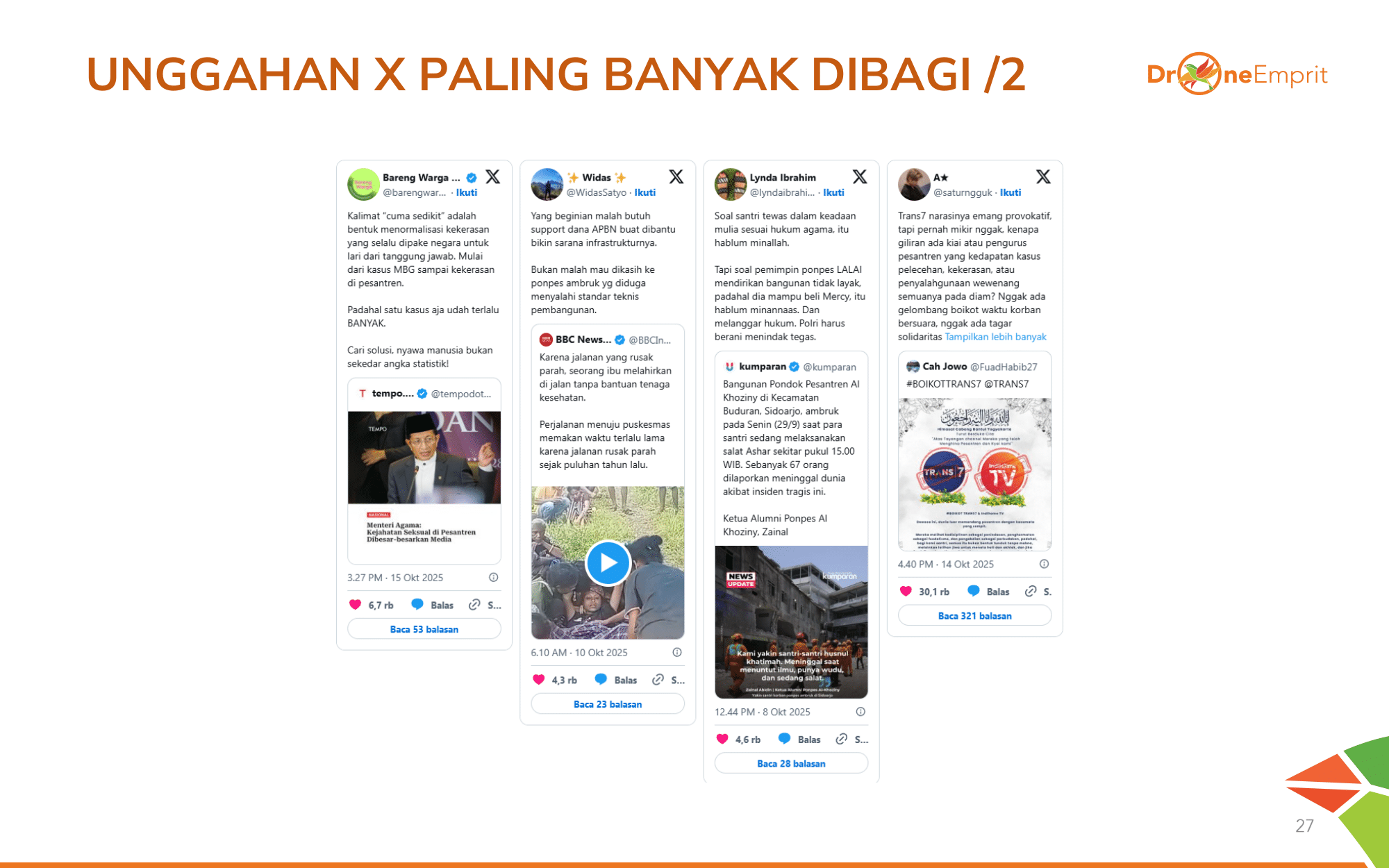 TikTok didominasi oleh konten pro-pesantren dan berita viral. Video-video dengan puluhan juta tayangan memiliki narasi yang membela atau mengkritik perlakuan terhadap santri. Unggahan mana saja yang paling viral di X?