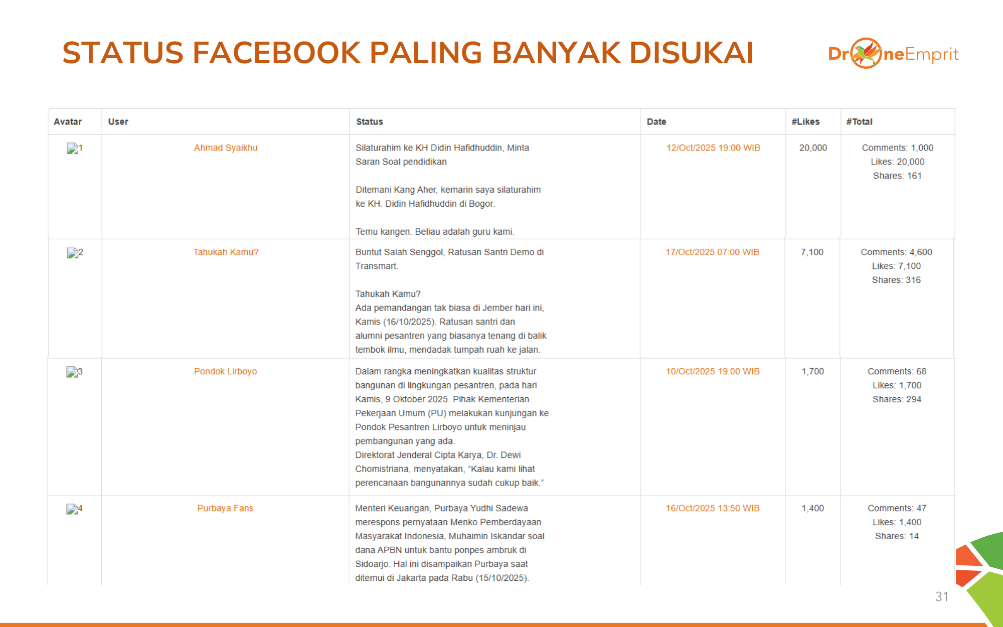 Di Facebook, unggahan populer sangat beragam. Postingan silaturahmi tokoh politik mendapat interaksi positif, namun status dari "Tahukah Kamu?" yang mengulas demo santri dengan narasi kritis justru menjadi yang paling viral.