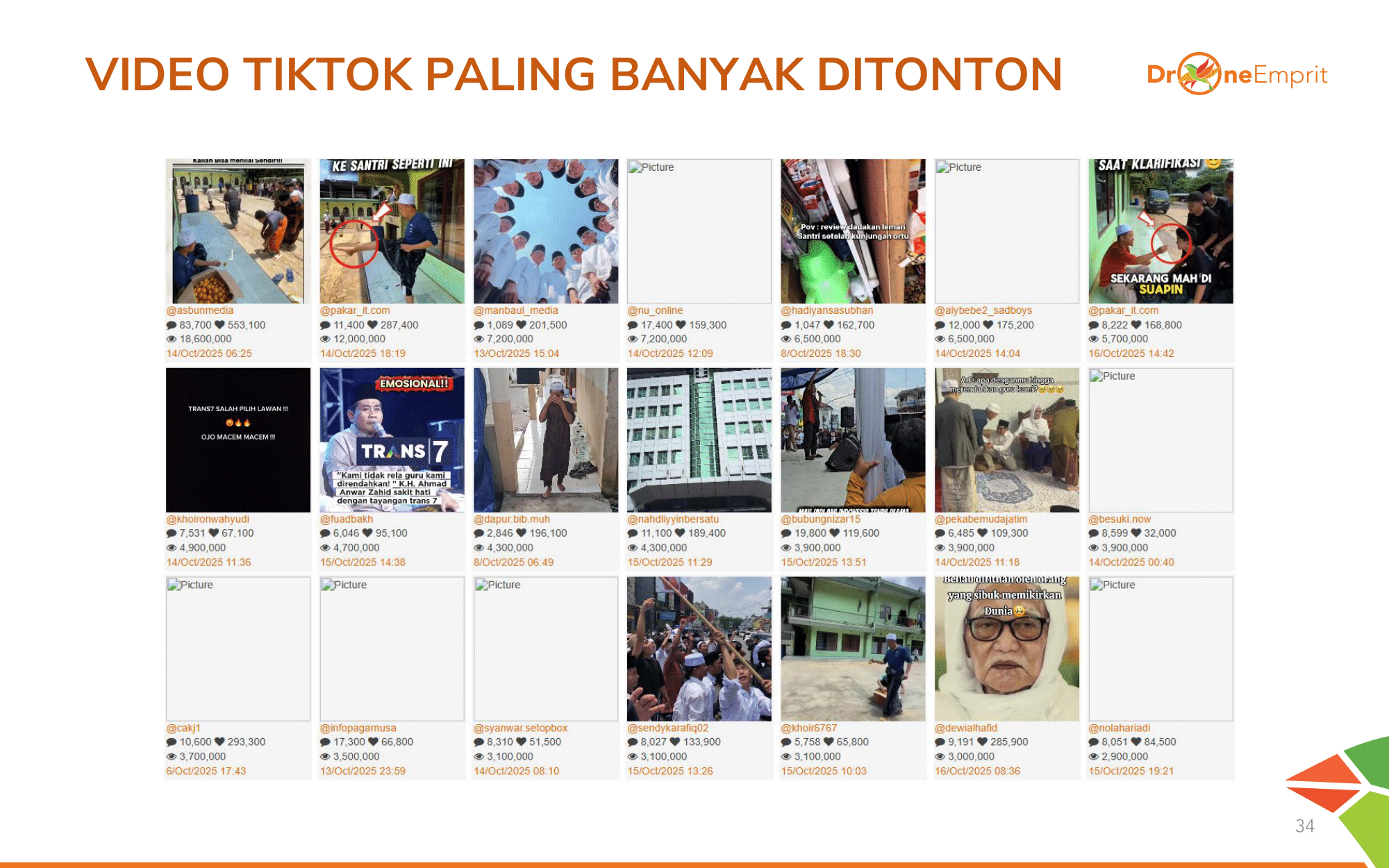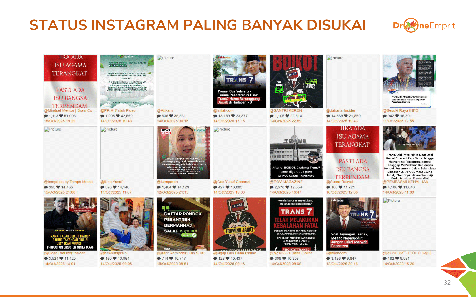 Unggahan paling disukai di Instagram datang dari akun motivasi yang menarasikan isu ini sebagai pengalihan dari masalah bangsa yang lebih besar. Di sisi lain, seruan #BoikotTrans7 dari akun-akun pesantren juga mendapat puluhan ribu suka.