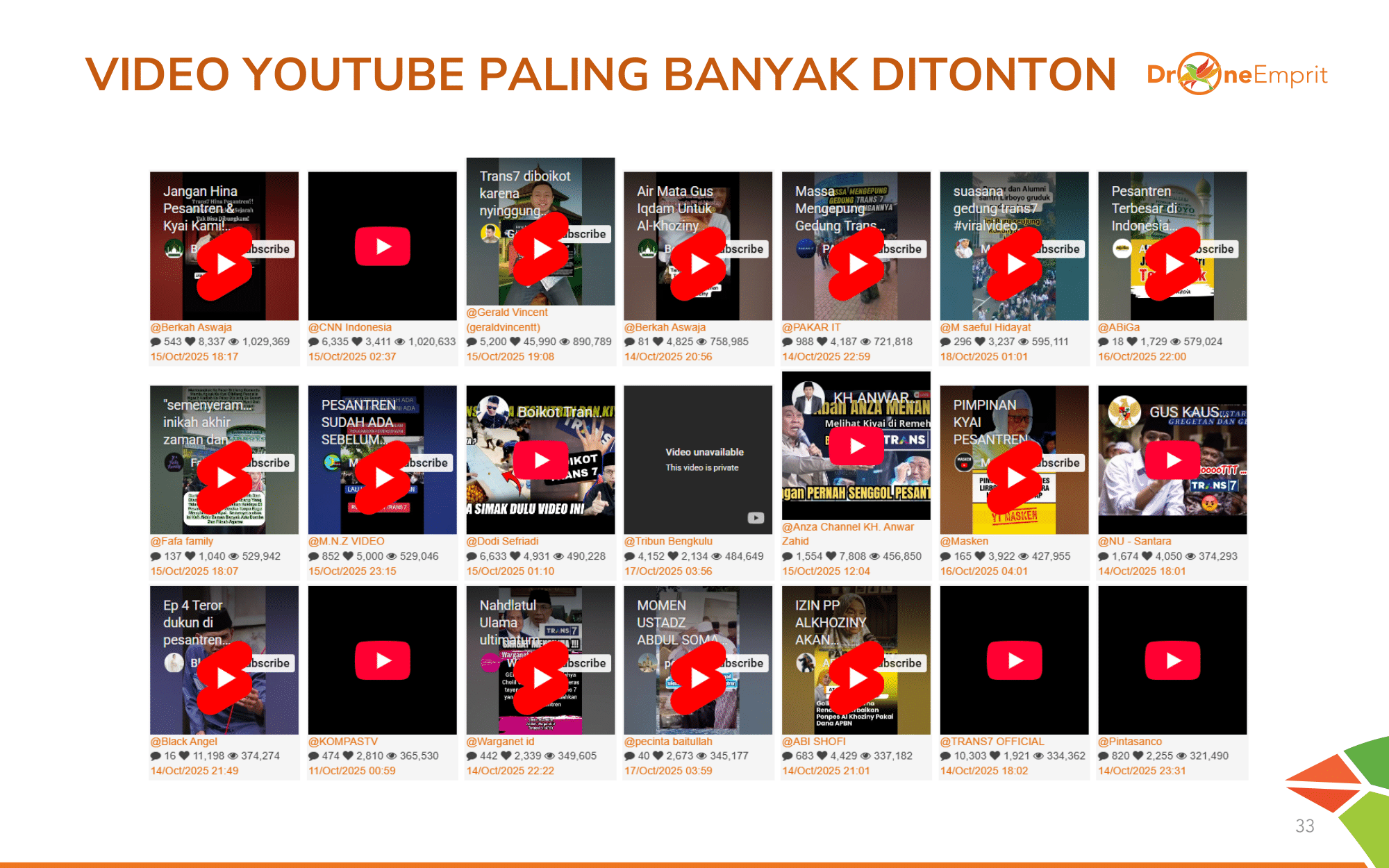 Video terpopuler di YouTube terbelah antara pembelaan terhadap pesantren (shorts "Jangan Hina Pesantren Kami") dan berita klarifikasi dari media (CNN Indonesia & Trans7). Konten kreator yang membahas dari sudut pandang netral-kritis juga mendapat banyak penonton.