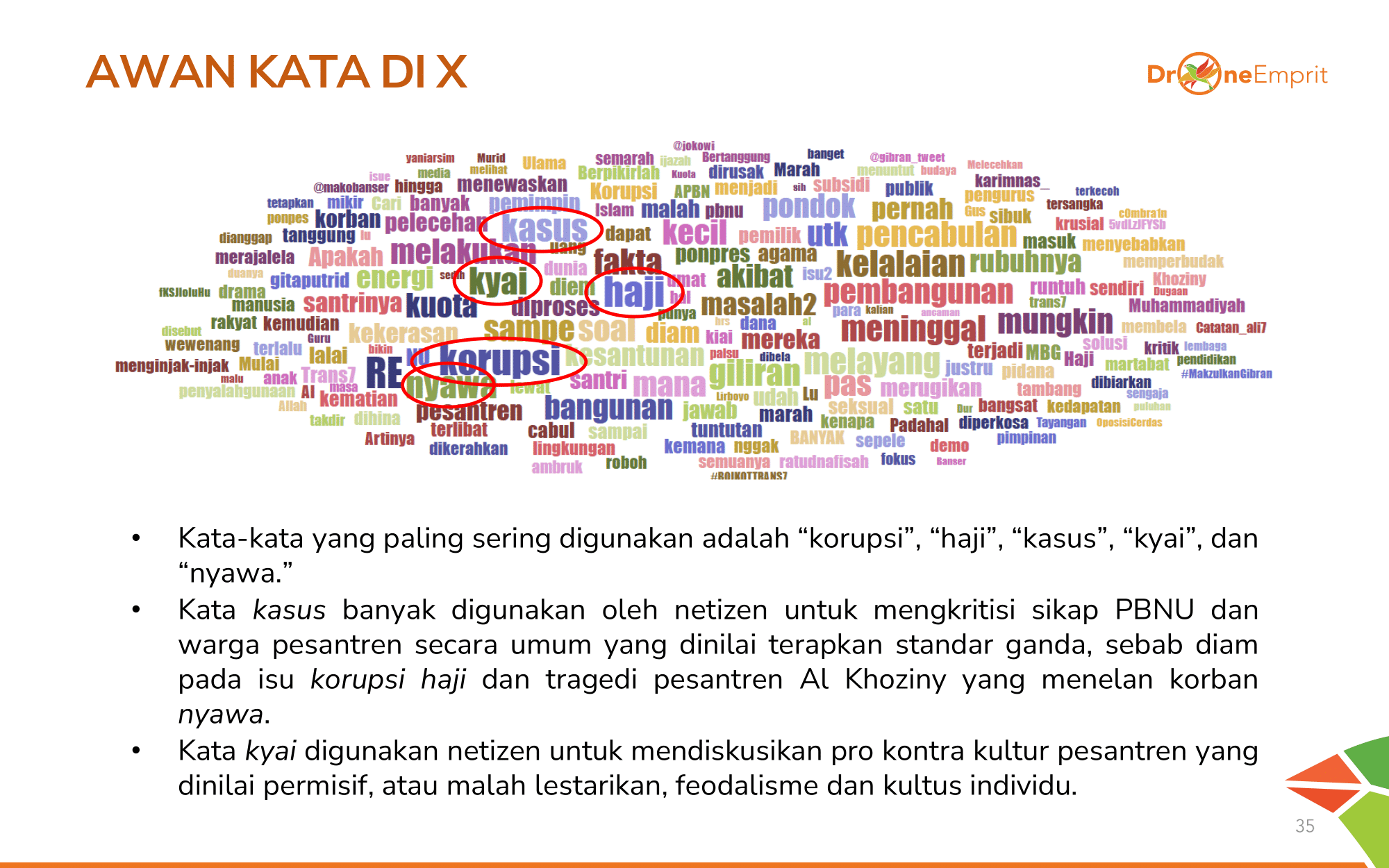 Percakapan di X terbagi menjadi 4 klaster utama: narasi komunitas santri, komunitas Islam modern yang lebih moderat, publik umum & aktivis yang kritis, serta narasi faktual dari media.
