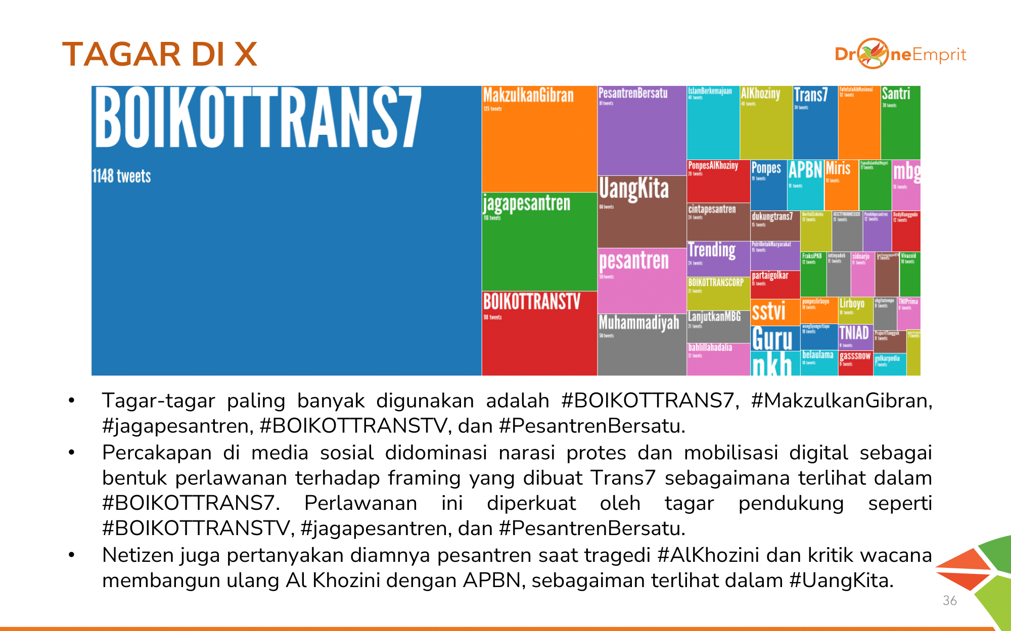 #BOIKOTTRANS7 menjadi tagar utama, didukung oleh tagar solidaritas seperti #jagapesantren. Namun, tagar kritis seperti #UangKita juga muncul sebagai bentuk protes terhadap wacana penggunaan APBN untuk Ponpes Al Khoziny.