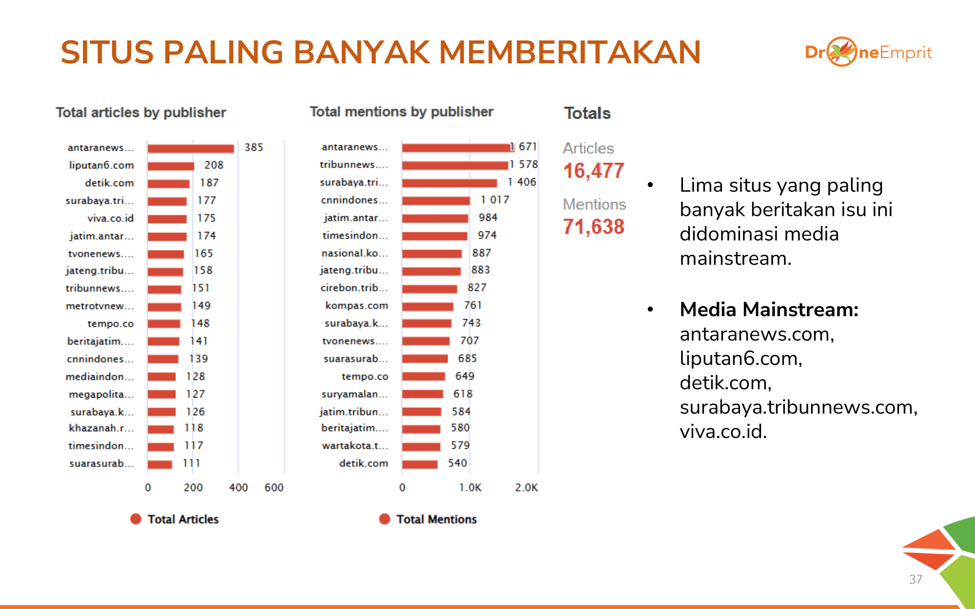 Isu ini diliput secara masif oleh media mainstream nasional. Antaranews.com, Liputan6.com, dan Detik.com menjadi tiga situs teratas yang paling sering memberitakan, menunjukkan signifikansi isu ini di level nasional.
