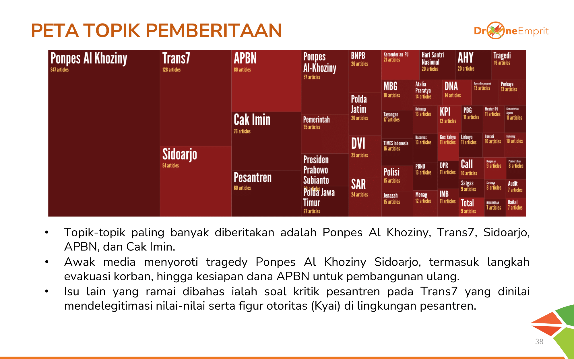 Pemberitaan media berpusat pada dua kutub: tragedi Ponpes Al Khoziny di Sidoarjo, termasuk soal wacana dana APBN, dan kontroversi Trans7 beserta reaksi keras dari komunitas pesantren.
