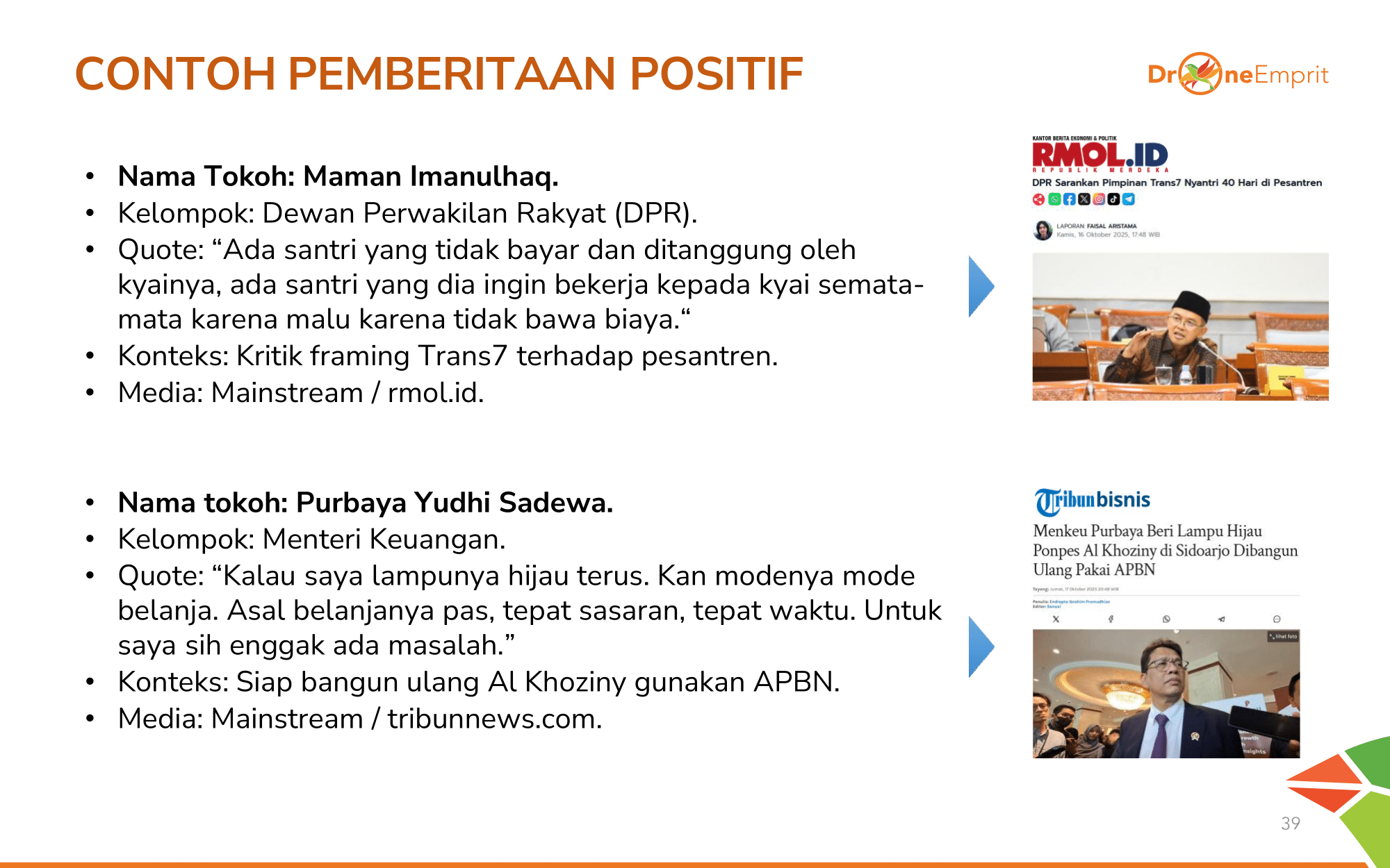 Pemberitaan positif fokus pada dua hal: pembelaan terhadap kultur pesantren dari anggota DPR dan pernyataan kesiapan Menteri Keuangan untuk membangun ulang Ponpes Al Khoziny menggunakan APBN, yang dinilai sebagai bentuk kehadiran negara.